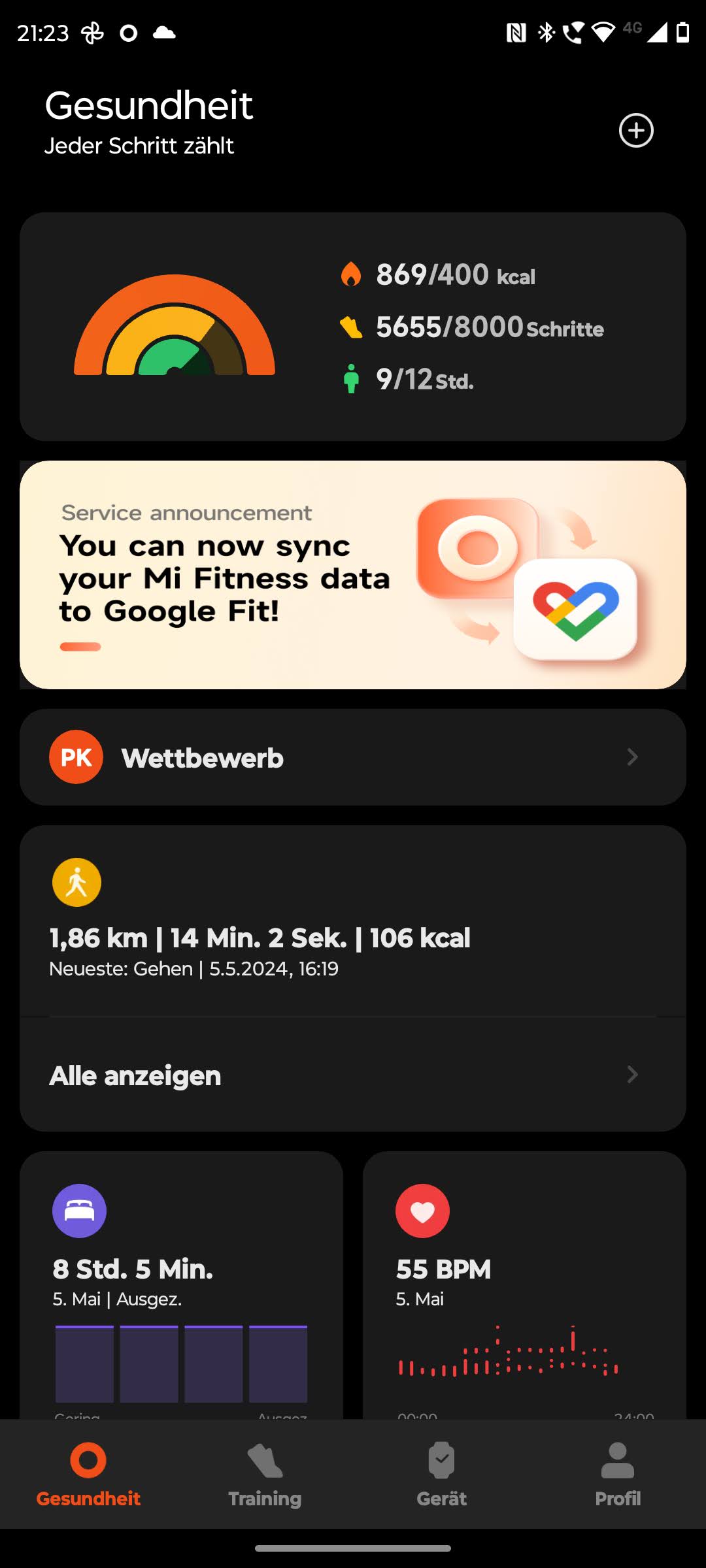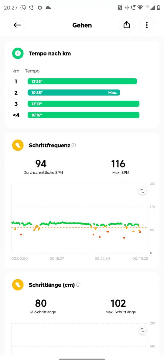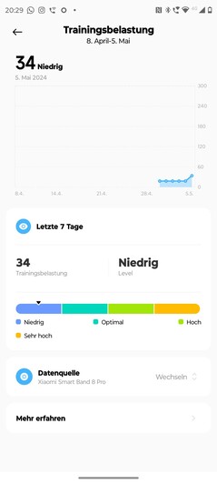 Die Streckendaten können nicht über die App exportiert werden, sondern über das Mi-Fitness-Onlineportal. Ein absolvieren eigener Tracks in den Trainings ist mit dem Tracker nicht möglich. Dafür kann das Smart Band 8 Pro Trainings automatisch aufzeichnen, das funktioniert beim Gehen, Laufen, Radfahren, Rudern und auf dem Crosstrainer.