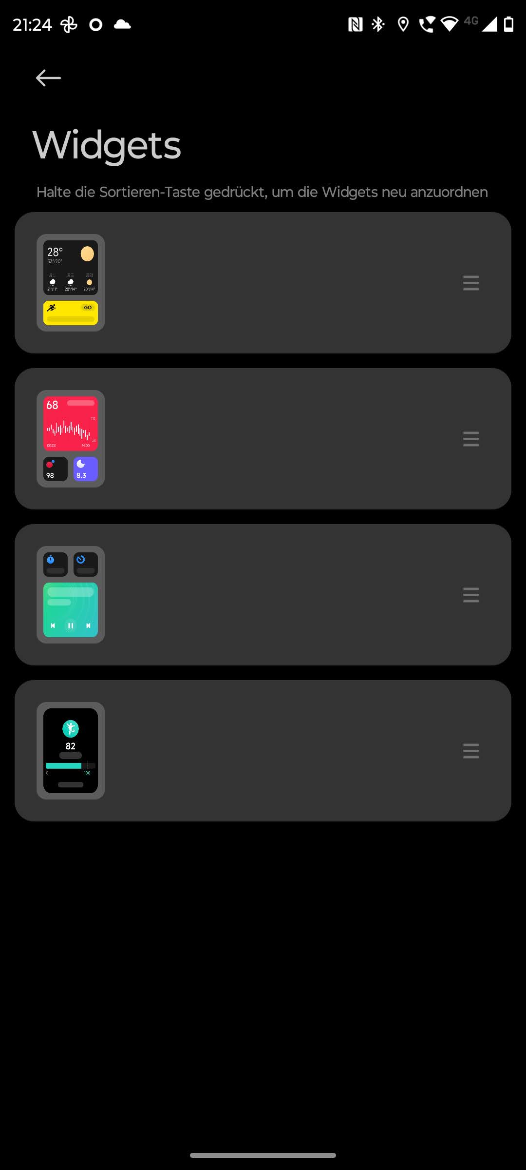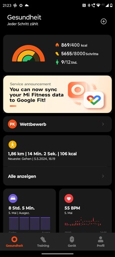Die Bewegungsziele werden von der Mi-Fitness-App ganz oben auf der Startseite präsentiert. Auch das Smartband kann die Werte auf Kacheln oder teils direkt im Zifferblatt einblenden. Dabei arbeitet Xiaomi mit Halbkreisen für die grafische Darstellung. Abgebildet werden verbrannte Kalorien, absolvierte Schritte und Zeit in Bewegung.