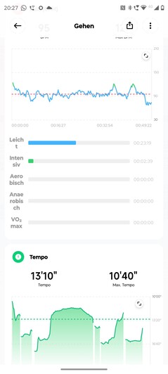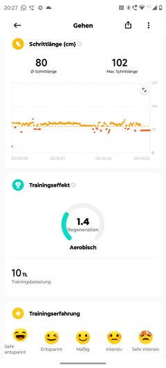 Während des Trainings zeigt das Smart Band 8 Pro den Status der Satellitenverbindung und die Pulsfrequenz prominent an. Beim Puls wird nicht nur der Wert, sondern auch die Zone angezeigt. Nach dem Training gibt die Mi-Fitness-App weitere Daten aus, etwa die Schrittfrequenz, die Schrittlänge und den Trainingseffekt. Auch eine Regenerationszeit wird empfohlen.