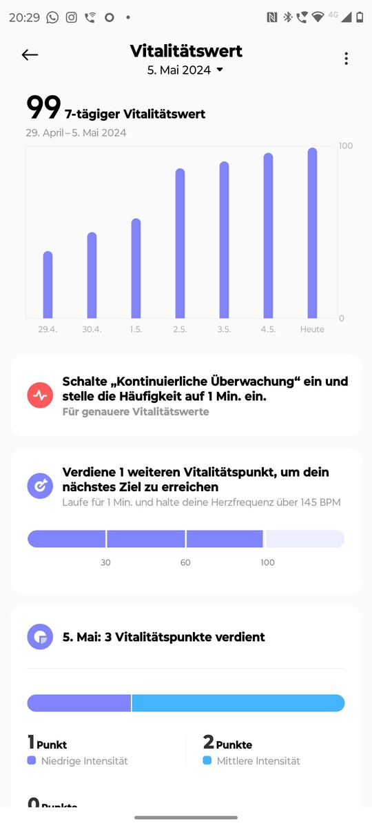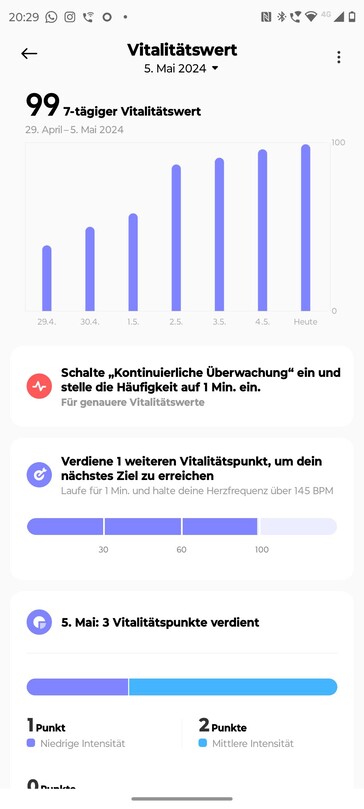 Dabei ist nicht nur die Zeit der Trainings relevant, sondern auch die Intensität. Laut Xiaomi orientiert sich die Klassifikation an den WHO-Leitlinien für regelmäßige Bewegung. Maximal können pro Tag 80 Punkte erzielt werden.