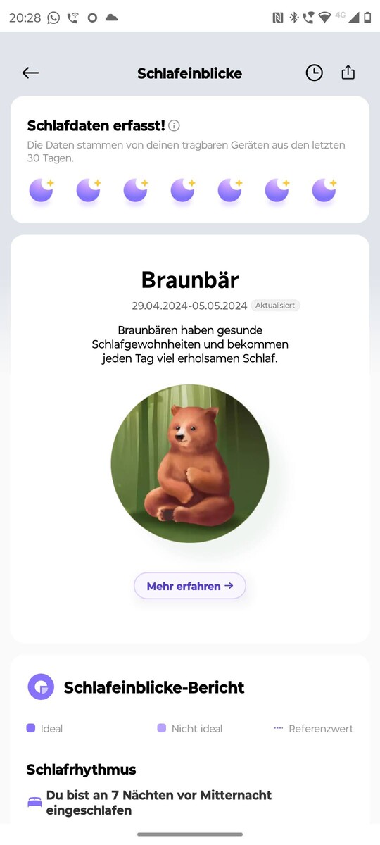 Auch der Gesamtschlaf wird mit einer Schlafpunktzahl und einer Wortnote versehen. Wird das Wearable mindestens sieben Nächte in Folge getragen, vergibt die Mi-Fitness-App dem Nutzer ein Schlaftier und ordnet das Schlafverhalten entsprechend ein. Dabei werden Schlafrhythmus und -Kontinuität ebenso berücksichtigt wie das Stresslevel und Bewegung vor dem Schlafengehen. Die Software erstellt zudem einen Zeitplan für den Tag, um die Voraussetzungen für guten Schlaf zu schaffen.