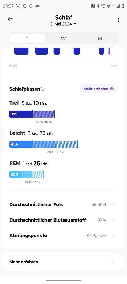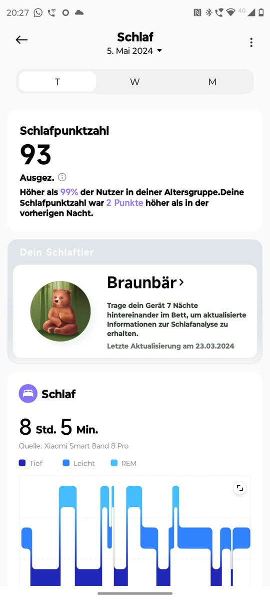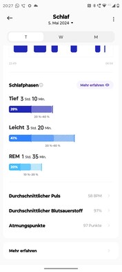 Das Schlaftracking des Xiaomi Smart Band 8 Pro ist umfangreich. Der Tracker zeichnet die gesamte Schlafenszeit auf und unterteilt sie in Leicht-, Tief- und REM-Schlaf. Dabei gibt die Software sowohl eine Zeit für die jeweilige Phase an als auch ihren Anteil in Prozent am Gesamtschlaf. Die persönlichen Werte werden zudem mit denen anderer Nutzer der gleichen Altersklasse ins Verhältnis gesetzt. Auch Wachzeiten werden im Test zuverlässig erkannt.