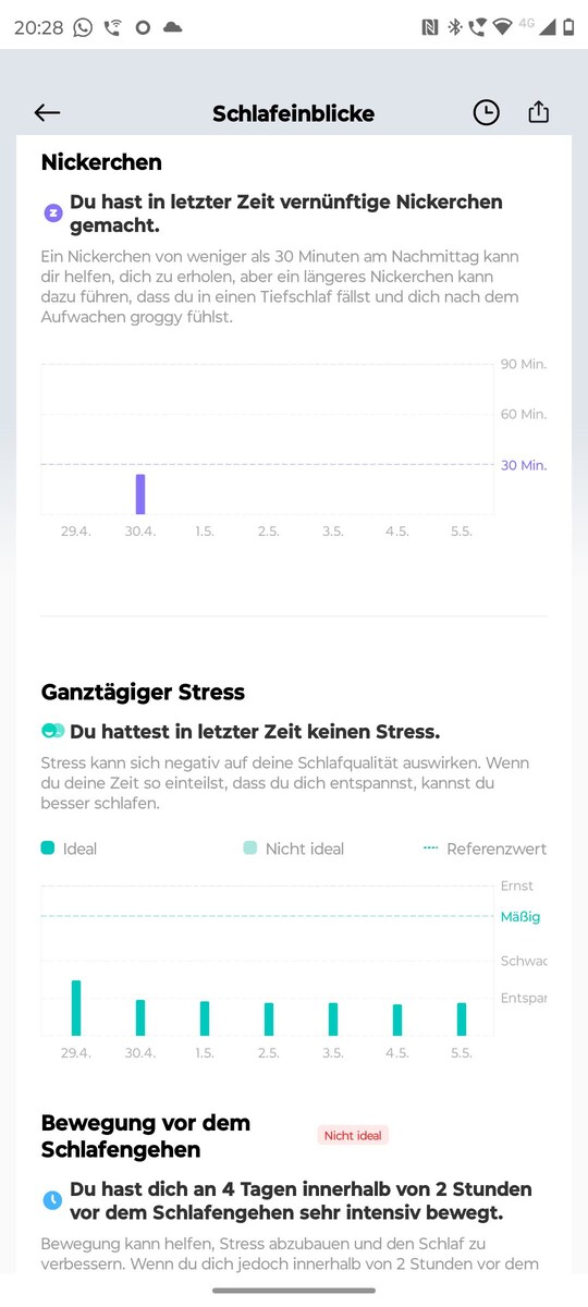 Alle Fitnessdaten und Körperwerte des Xiaomi Smart Band 8 Pro werden in der Mi-Fitness-App gesammelt. Der Tracker erhebt Daten für Herzfrequenz, Blutsauerstoffsättigung, Stress, Schlaf und Bewegung. Die Daten für jeden Bereich werden für einen Tag, aber auch für eine Woche oder einen Monat ausgegeben.