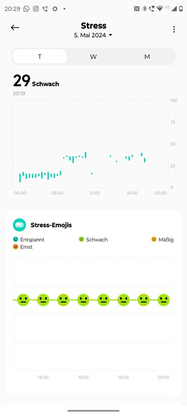 Stress wird mit einem Punktewert zwischen 0 und 100 angegeben. Zudem kann anhand eines Zeitstrahls die Entwicklung über eine Zeitspanne - etwa einen Tag - verfolgt werden. Die Software teilt den Stress außerdem in vier Phasen ein und klassifiziert ihn mit passenden Emojis.