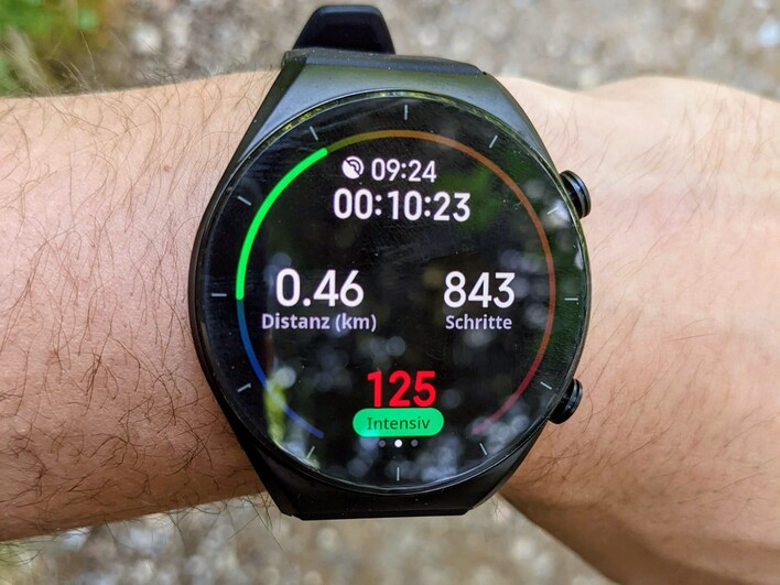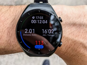 117 verschiedene Trainingsmodi soll die Watch S1 bieten. Die haben wir nicht alle getestet, allerdings waren wir mit der Uhr Joggen, Radfahren und Schwimmen. Laufen und Gehen wird von der Uhr auf Wunsch automatisch erkannt und ein entsprechendes Training gestartet. Bei allen anderen Sportarten ist eine Aktivierung über das Sportmenü notwendig. Die Strecke wird über GNSS aufgeezeichnet, für die Messung der Höhenmeter ist ein Barometer an Bord. Beim Laufen gibt die Smartwatch Auskunft über Tempo, Pulsfrequenz, Schritte, und Schrittfrequenz. Die Gesamtdaten werden auch in Daten für die einzelnen Kilometer aufgelöst. Zudem vibriert die Uhr bei jedem absolvierten Kilometer und gibt einen Zwischenstand. Allerdings fehlt einee Einschätzung der Trainingsbelastung und eine Empfehlung für Ruhezeiten. Positiv ist, dass die Watch S1 kurze Pausen beim Laufen automatisch erkennt und das Training pausiert. Zum Glück wird die Aufzeichnung beim erneuten Loslaufen auch automatisch fortgesetzt. Ärgerlich ist, dass die Smartwatch sich nicht die gewählte Ansicht im Trainingsmenü merkt, sondern nach jedem Erlöschen des Diaplays neu auf die Wunschansicht gewischt werden muss.