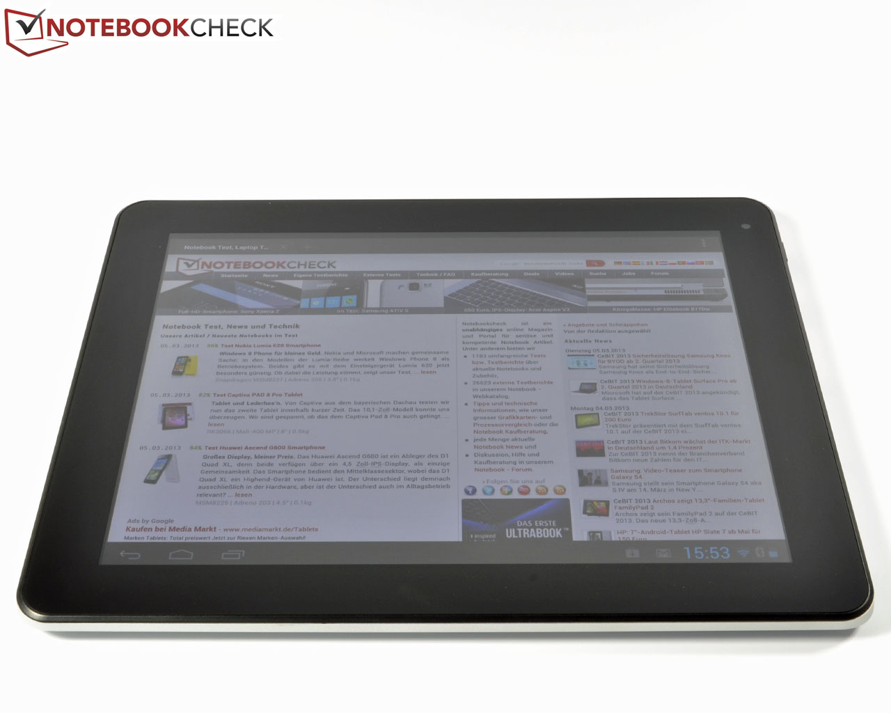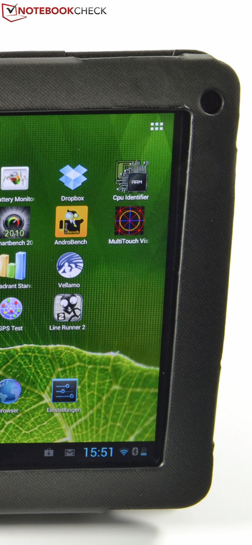 Das Haupteingabegerät eines jeden Tablets stellt der kapazitive Touchscreen dar, der im vorliegenden Fall Eingaben von bis zu 10 Fingern entgegennehmen kann. Multitouch-Gesten werden zuverlässig erkannt und die Glasoberfläche weist gute Gleiteigenschaften für die Finger auf. Alternativ kann auch via USB eine Maus angeschlossen werden, was im Test problemlos funktionierte. Die virtuelle Tastatur ist im Standard-QWERTZ-Layout von Android gehalten und nimmt gerade im Querformat sehr viel Platz auf dem Bildschirm ein. Die automatische Drehung des Bildinhaltes beim Drehen des Tablets klappt anstandslos, benötigt aber gefühlt einen Augenblick länger als nötig wäre.