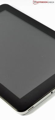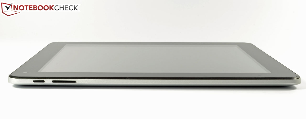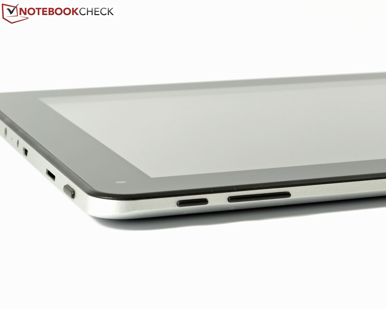 Die physikalischen Tasten bieten ein gutes Feedback dank deutlichem Druckpunkt und ausreichend großem Tastenhub. Der Lautstärkeregler sitzt an der oberen Breitseite des Tablets, direkt daneben befindet sich eine ESC-Taste, die dieselbe Funktion übernimmt wie die Touchtaste "Zurück" am unteren Bildrand. Der Powerknopf befindet sich an der rechten Seitenkante und ist damit nicht ideal platziert, da er sich neben dem microSD-Kartenslot befindet. Ist man das Layout noch nicht gewöhnt, könnte man versehentlich die microSD-Karte entnehmen und riskiert dadurch einen Datenverlust. Im Test passierte uns dieser Fehlgriff gerade zu Testbeginn des öfteren. Zudem ist die Positionierung der Schnittstellen nicht sinnvoll, denn im Quermodus werden diese immer von einer Hand verdeckt.