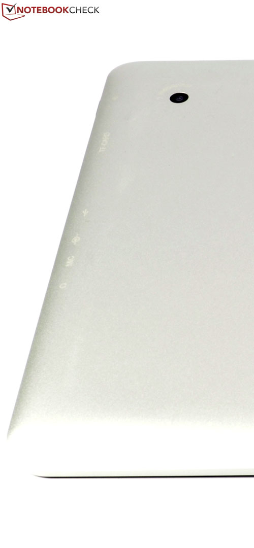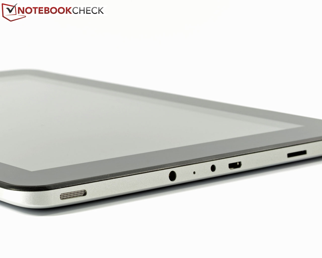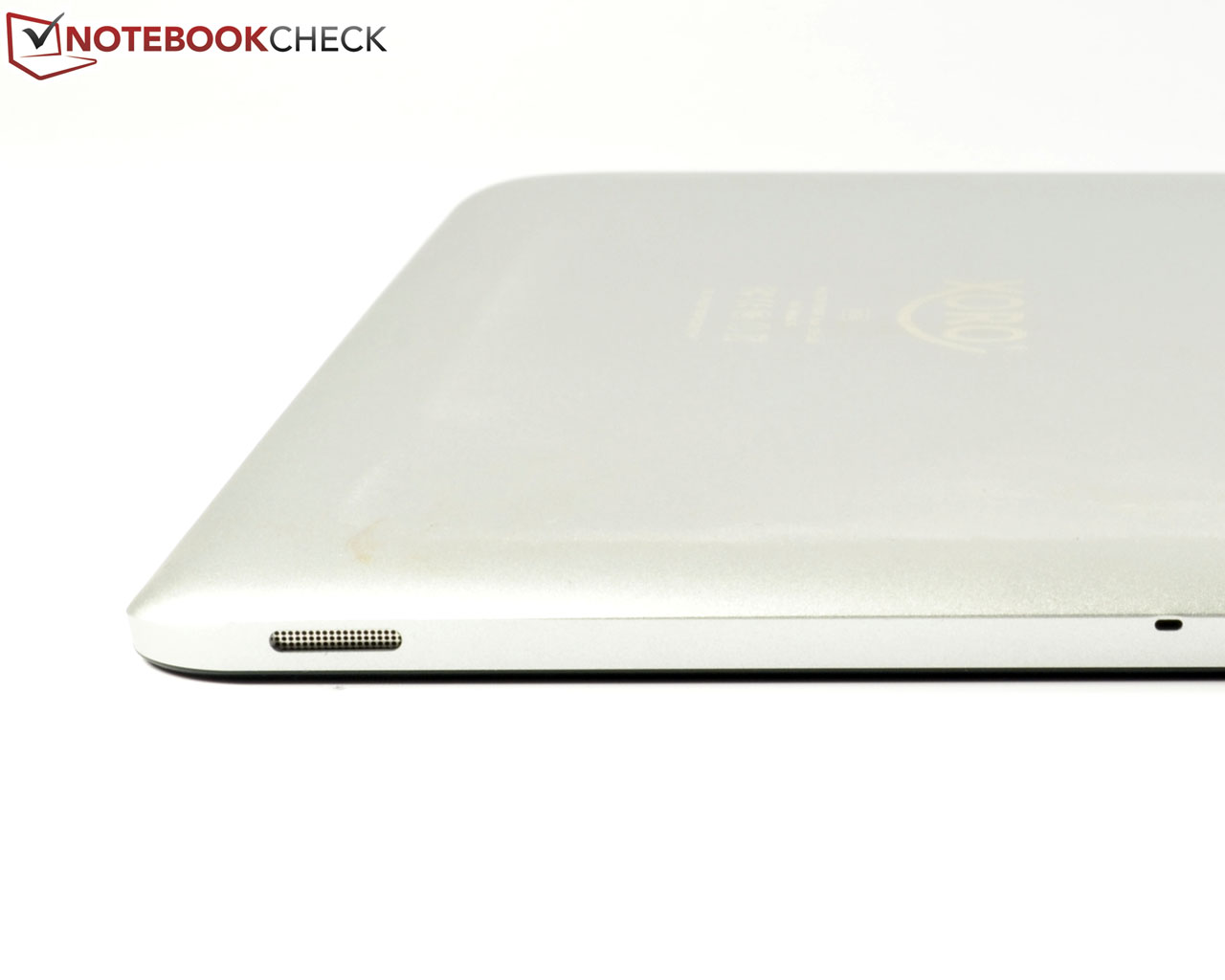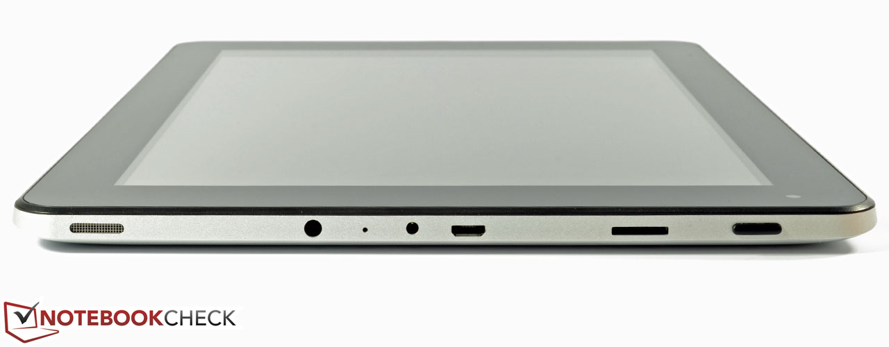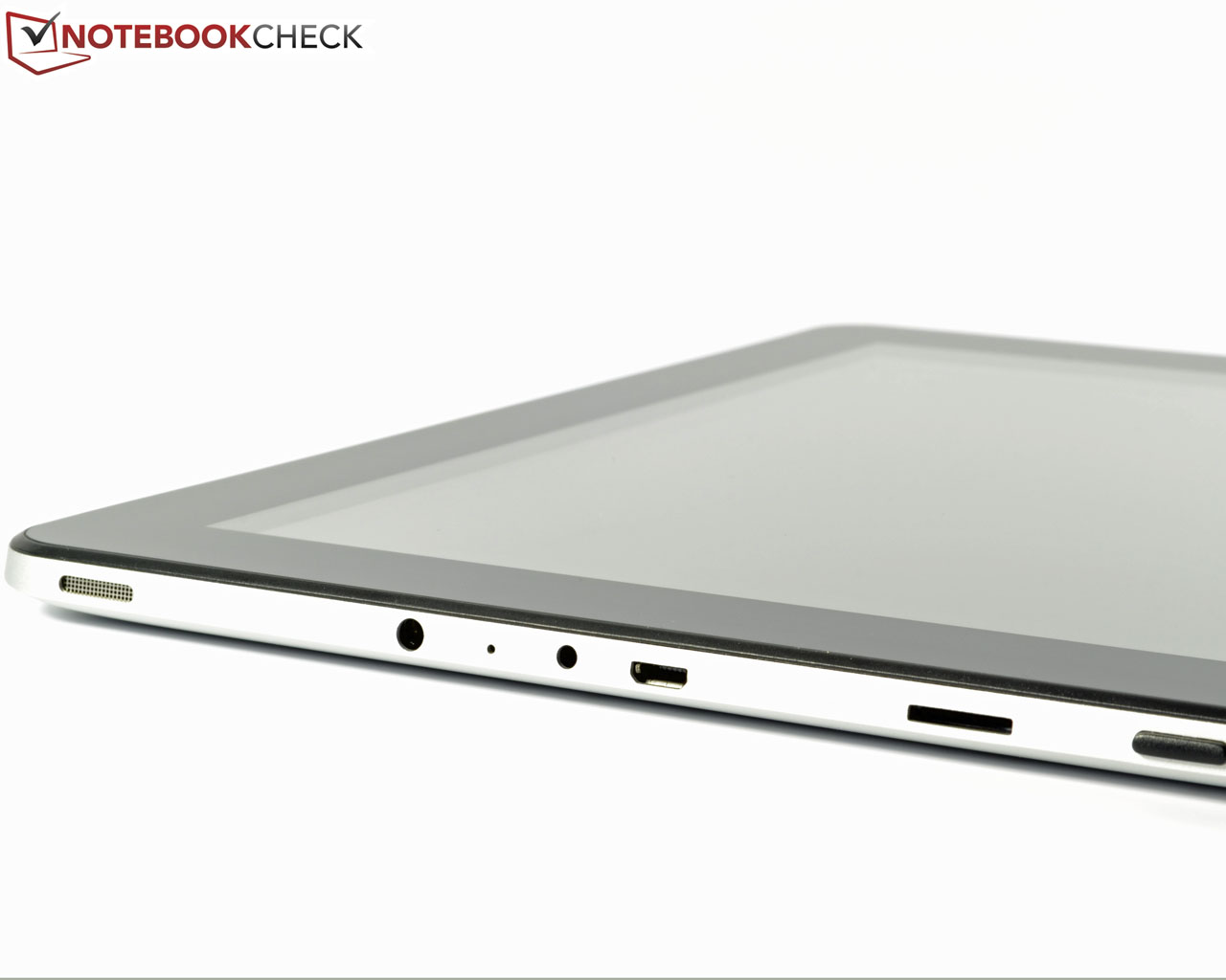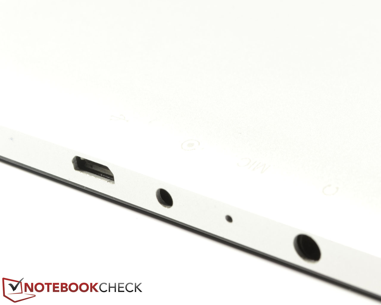 Die Anschlussvielfalt des Testsamples entspricht der vieler Mitbewerber. Neben einer Micro-USB-Schnittstelle befinden sich noch ein microSD-Slot und ein proprietärer Strom-Port sowie eine 3,5-mm-Klinkenbuchse an der rechten Seitenkante des Chassis. Ein mini-HDMI-Port zur externen Bildausgabe fehlt leider. Schade: Via USB lässt sich das Tablet nicht aufladen. Außerdem empfiehlt der Hersteller, das Gerät nicht während des Ladevorgangs zu nutzen. Das funktioniert zwar, allerdings überträgt die Aluminium-Rückseite dabei einen unangenehmen Ladestrom. Ein Lithium-Polymer-Akku mit 10.000 mAh versorgt das Tablet mit Strom.