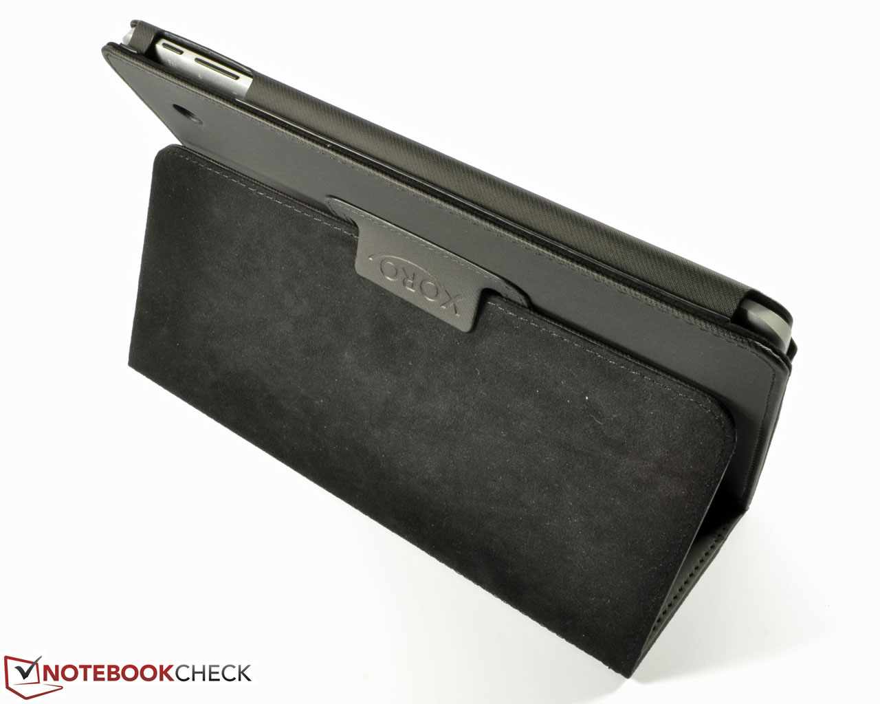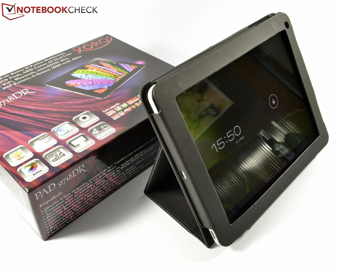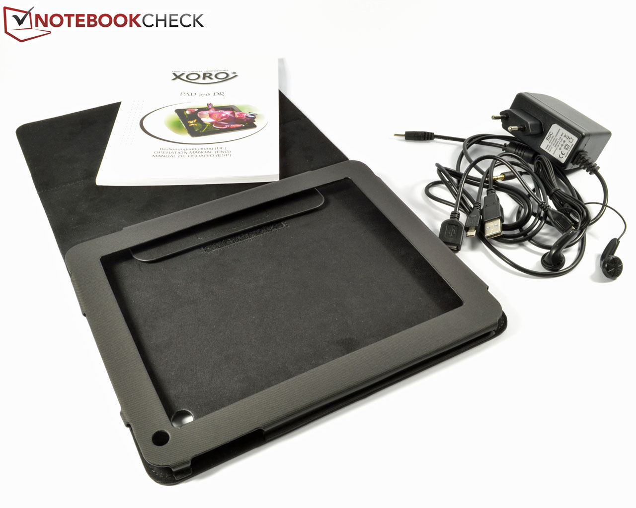 Hier sticht das Xoro PAD 9718DR etwas aus der Masse heraus. Neben dem Tablet selbst und einem 24-Watt-Netzteil legt der Hersteller einen USB-OTG-Adapter, ein knapp 1m langes USB-Kabel und ein Standard-Headset bei. Darüber hinaus befinden sich im Karton noch eine Kunststoff-Schutztasche und eine mehrsprachige gedruckte Anleitung. Erstere macht einen ordentlichen Eindruck und dient dank Klappmechanismus auch als Ständer beim Filmschauen. Die schwarz-weiße Anleitung ist zwar ausführlich und bebildert, kann aber aufgrund vieler Übersetzungsfehler die chinesische Herkunft nicht verleugnen.