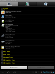 Zunächst sehen wir uns die browser-basierten Benchmarks an. Den Browser-Geschwindigkeitstest Sunspider 0.9.1 schafft das Testsample in nur 1.180,1 ms und hängt damit die Vergleichsgeräte Pearl Touchlet X10.dual mit 1.242,7 ms, Prestigio MultiPad 10.1 Ultimate mit 1.741,5 ms teils deutlich ab. Nur das Archos 97 Titanium HD kann mit 1.195,9 ms noch mithalten. Im Google V8 Ver.7 Benchmark werden 1.831 Punkte erreicht, hier spielt das Testsample auf Augenhöhe mit dem Archos 97 Titanium HD (1.837 Punkte), das Prestigio MultiPad 10.1 Ultimate hat mit 1.432 Punkten das Nachsehen. Im Peacekeeper Benchmark punktet das Xoro PAD 9718DR mit 641 Zählern klar vor dem Prestigio MultiPad mit 466 Punkten. Der Browsermark 2.0 wollte sich auch nach mehrmaligen Versuchen nicht starten lassen.