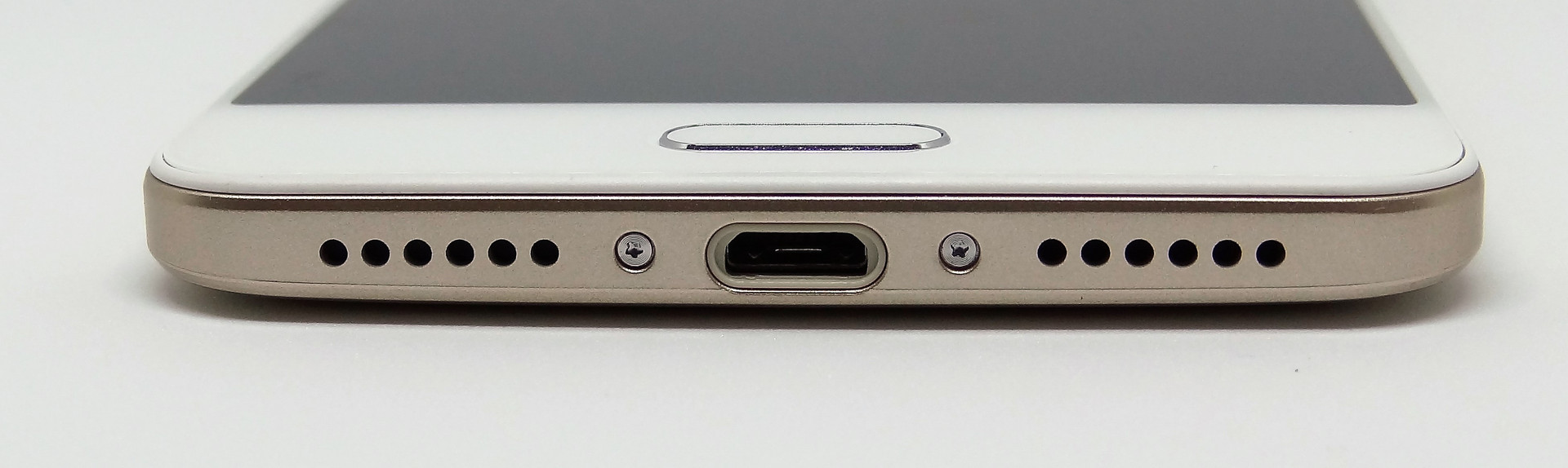Auf der Unterseite befinden sich der MicroUSB-Ladestecker und der Lautsprecher. Auf der Oberseite ist der 3,5 Millimeter-Klinkenanschluss angesiedelt. Links an der Seite der Slot, welcher entweder für zwei nanoSIM-Karten oder eine optionale microSD-Karte Platz bietet.