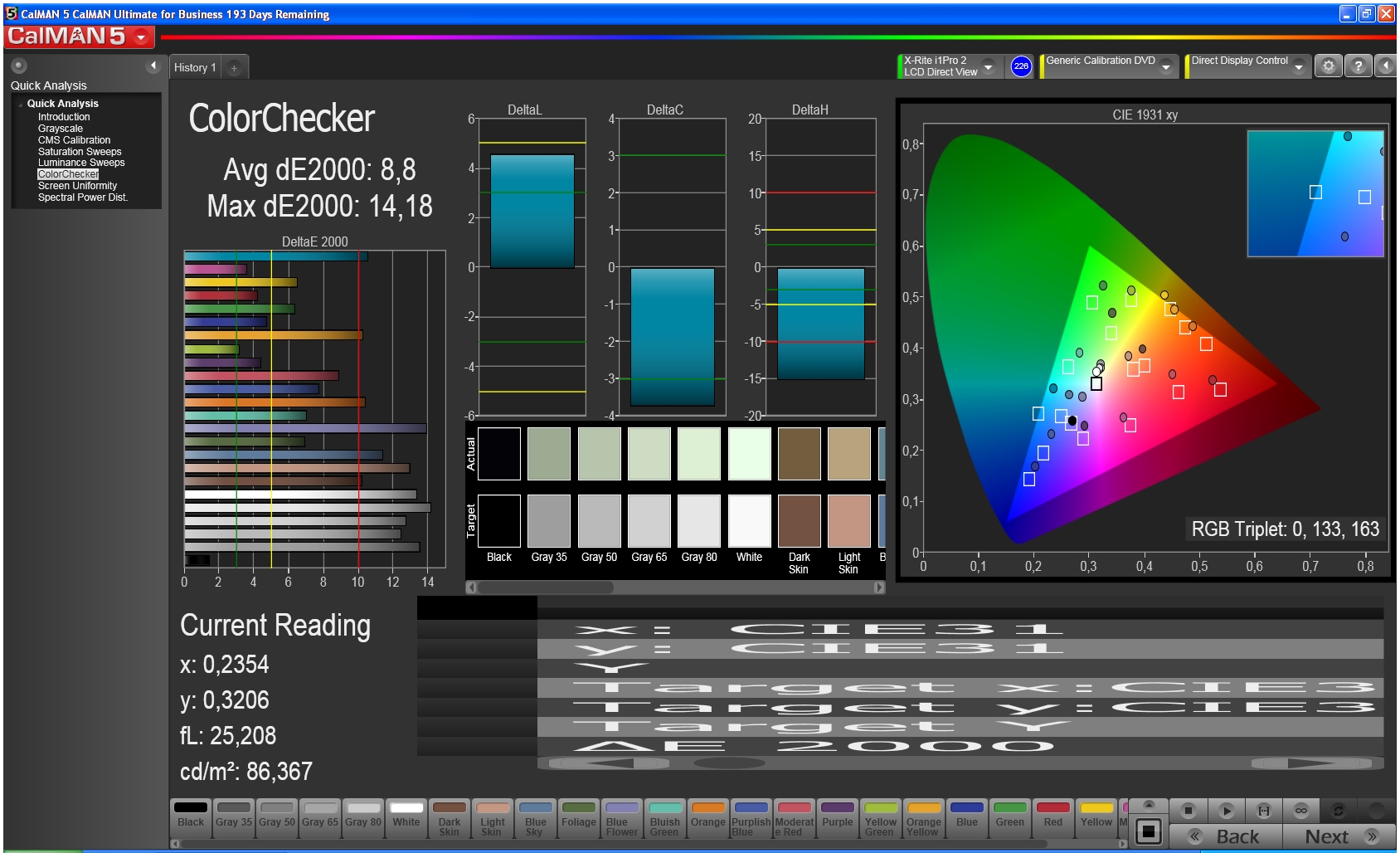 Wir untersuchen die Bildschirmdarstellung außerdem mit dem Kolorimeter und der Software CalMan. Hierbei fällt auf, dass sehr viele Farbtöne stark vom Idealwert des Referenzfarbraumes abweichen: Hellblau, Orange, Lila, Hellbraun und vor allem Weißtöne liegen über einem DeltaE-Wert von 10.