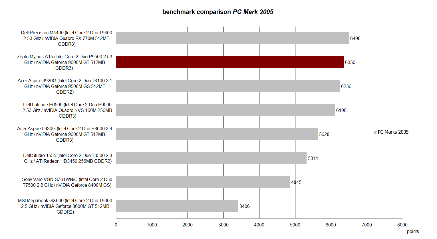 An vorderster Front steht das Zepto Mythos A15 im PC Mark 2005 Benchmarktest. Mit guten 6350 Punkten im Durchlauf des Anwendungsbenchmarktests positioniert sich das leistungsstarke Multimedianotebook im vordersten Feld vergleichbarer Laptops.
