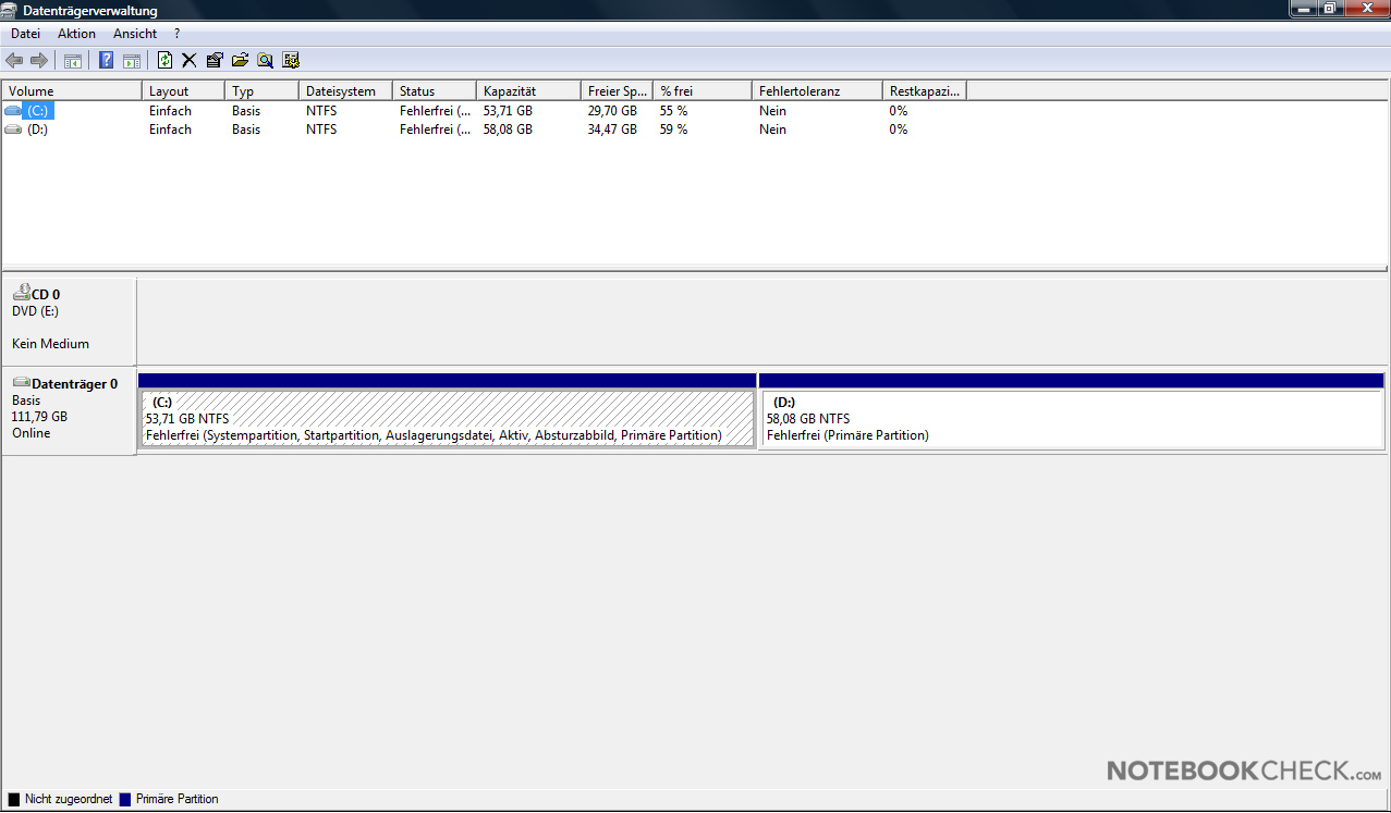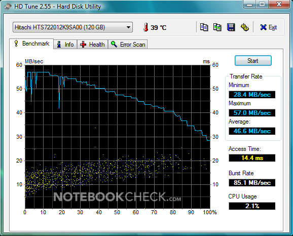 Bei den Massenspeichern sorgt eine Travelstar 7K200 HTS722012K9SA00 mit 120 GByte für schnellen Datentransfer. Die SATA-Festplatte HTS722012K9SA00 von Hitachi integriert statt 8 gleich 16 MByte (!) Cache. Zudem lässt die Travelstar 7K200 ihre Köpfe mit einer Geschwindigkeit von 7.200 U/min rotieren. Der Test mit HDTune bescheinigt der 2,5-Zoll-HDD eine durchschnittliche Transferrate von flotten 46,6 MB/s. Da muss sich auch die Referenzplatte ST910021A (100 GByte, 7.200 U/min) von Seagate mit knapp 42 MB/s geschlagen geben. Zusätzlichen Massenspeicher stellt der DVD-Brenner SN-S082H von TSST (Toshiba Samsung Storage Technology Corporation) bereit.