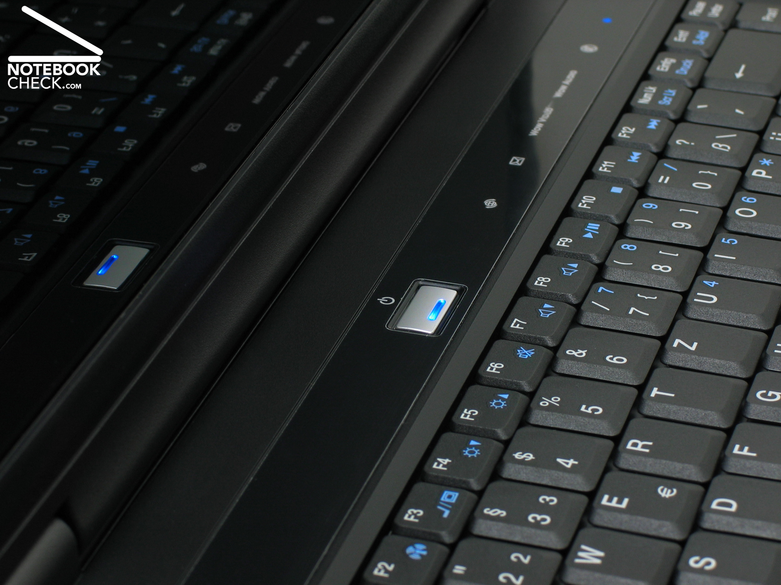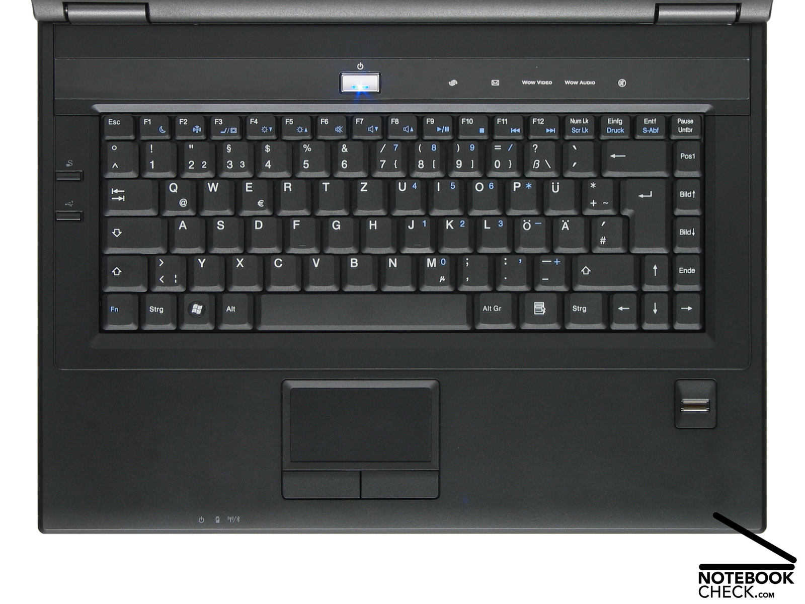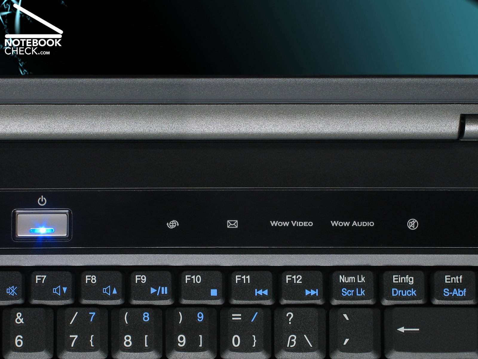 Oft benötigte Systemfunktionen lassen sich beim Znote 3415W mittels sieben Zusatztasten schnell bedienen. Zwei Sondertasten für Spezial-Funktionen sind links neben der Tastatur angeordnet. Mit der einen soll sich der Akku innerhalb einer Stunde zu 70 Prozent laden lassen. Die andere soll einen der links platzierten USB-Ports auch dann mit Strom versorgen, wenn das Notebook ausgeschaltet ist. Ein Trekstor-Player mit Festplatte ließ sich im Test daran aber nicht aufladen. Fünf weitere Zusatztasten für E-Mail, Webbrowser, WoW Video/Audio und zum Abschalten des Sounds sind als Sensorelemente vor dem Display angeordnet. Ungünstig: Die Status-LEDs lassen sich nur schwer ablesen.