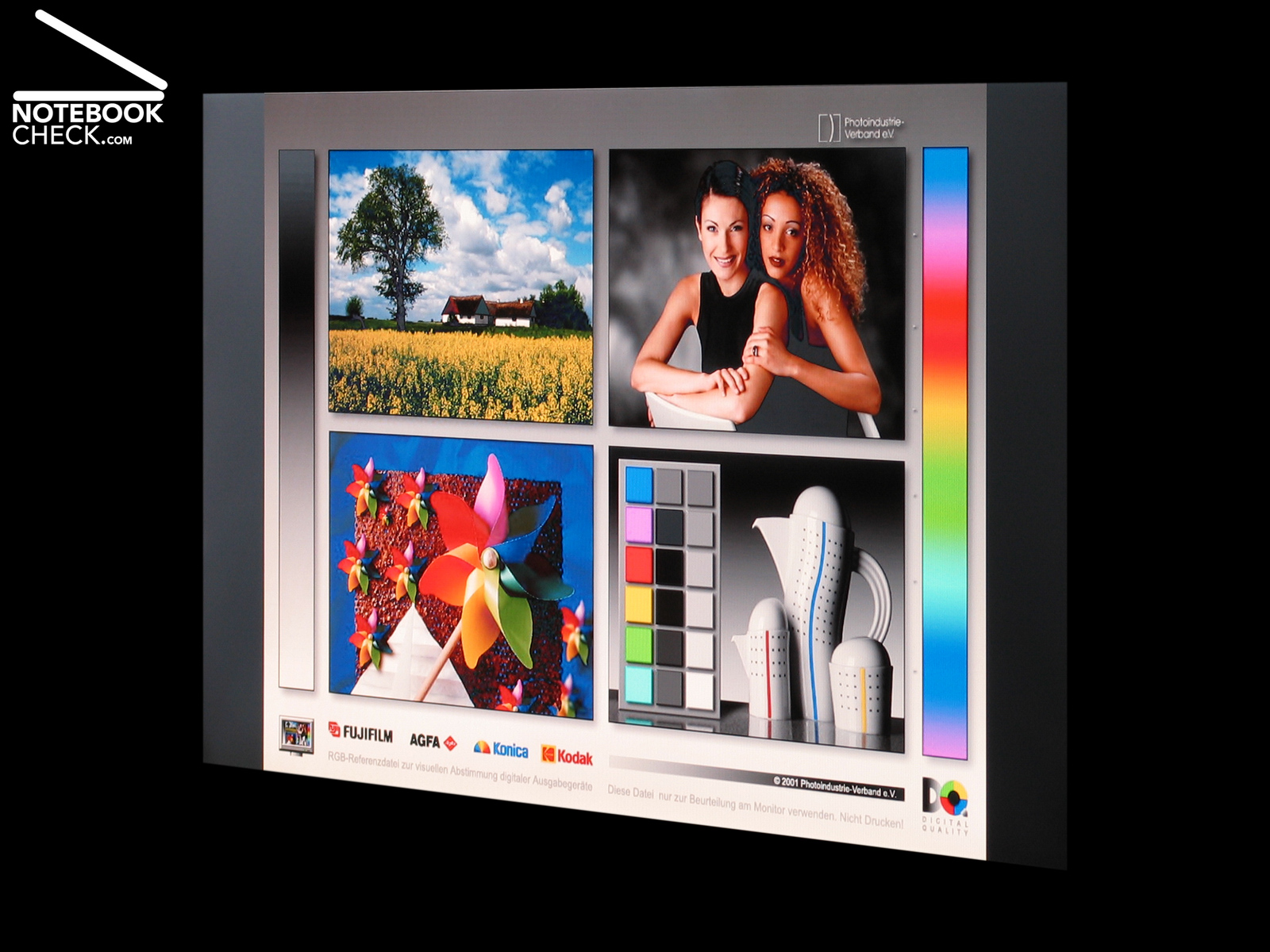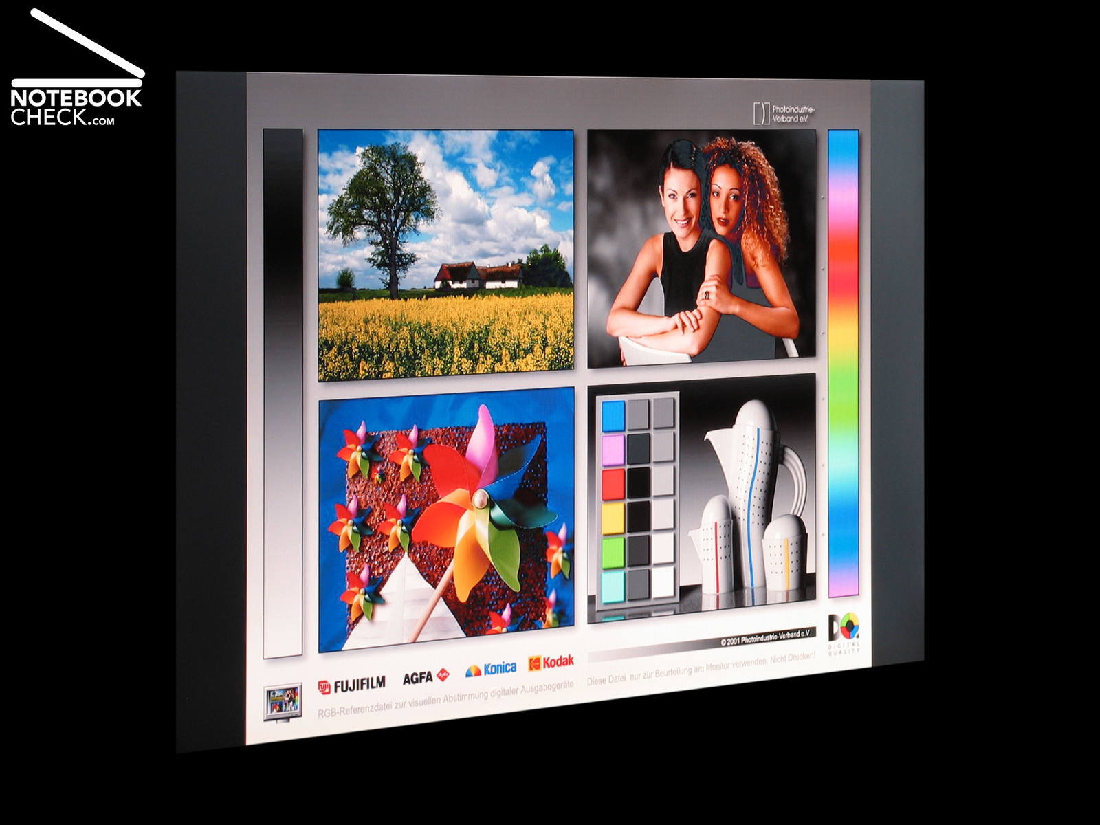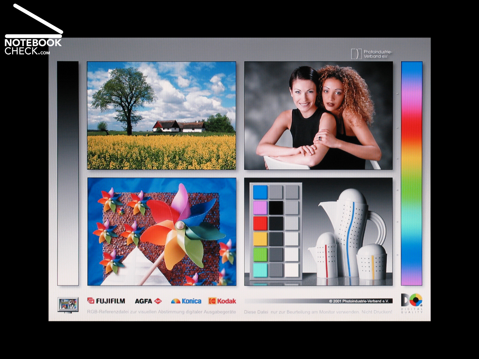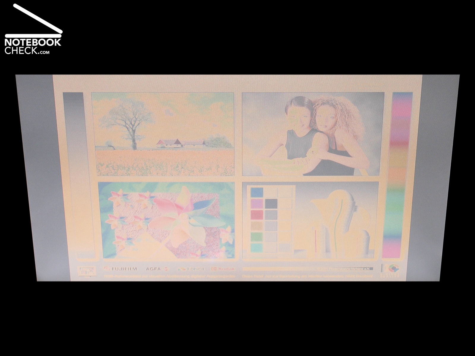 Bei sehr dunklen und schwarzen Bildhintergründen schlägt die Hintergrundbeleuchtung im unteren Bereich des Panels deutlich durch. Dies fällt aber beispielsweise beim Spielen eher weniger auf. Wie bei anderen Notebook-Displays dieser Klasse auch, bleibt die Bildwiedergabe des Znote 3415W nur in einem schmalen Blickwinkelbereich stabil. Insgesamt hinterlässt das 1.280 x 800 Bildpunkte auflösende WXGA-Display des Znote 3415W wegen seiner guten Allround-Eigenschaften ein positives Bild. Trotzdem erscheint das Panel – trotz neutraler Farbwiedergabe – für ambitionierte Foto- und Videoarbeiten eher weniger geeignet. Das doch deutliche Dithering wird derlei Ambitionen letztendlich einen Strich durch die Rechnung machen.