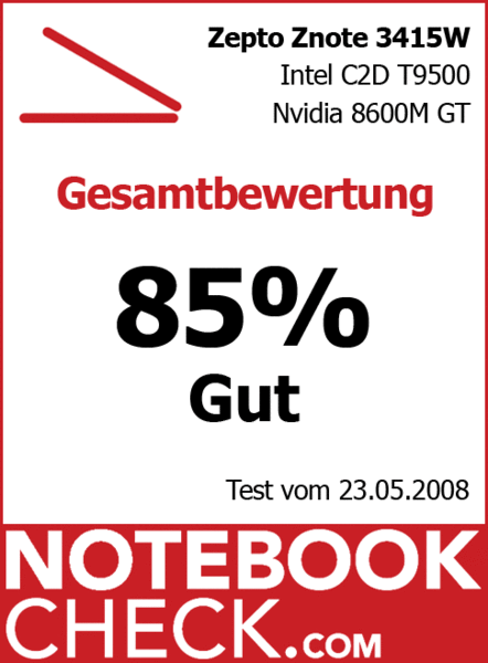 Das Znote 3415W von Zepto bietet in der Ausstattungsvariante „Power“ ordentlich viel Tempo. Zudem erhält der Kunde mit dem Zepto Znote 3415W „Power“ eine sehr schnelle und leise Arbeitsmaschine. Die üppige Ausstattung umfasst aktuelle Penryn-Prozessoren, eine große und schnelle 200-GByte-Festplatte, 4 Gigabyte Arbeitsspeicher und 300-MBit-WLAN. Daher dürften sich vor allem leistungsorientierte Anwender für das „Power“-Paket von Zepto interessieren. In der Notebook-Klasse „Multimedia“ erhält das Znote 3415W in Summe seiner Eigenschaften die Gesamtnote „gut“.