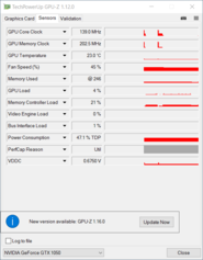 Die Taktraten entsprechen den Referenzwerten für die GTX 1050 von Nvidia. Der Basistakt der GPU beträgt 1.354 MHz (Boost: 1.455 MHz), der 2 GByte große GDDR5-Speicher wird mit effektiven 7.008 MHz betrieben. Im Leerlauf (Idle) wird der Chiptakt auf 139 MHz und der Speichertakt auf 202,5 MHz (effektiv 810 MHz) reduziert. In 3D-Anwendungen werden dank "Boost 2.0" oftmals höhere Taktraten erreicht als vom Hersteller zugesichert. Die maximal ermittelten Taktraten belaufen sich auf 1.695 MHz für die GPU und 1.752 MHz (effektiv 7.008 MHz) für den Speicher.