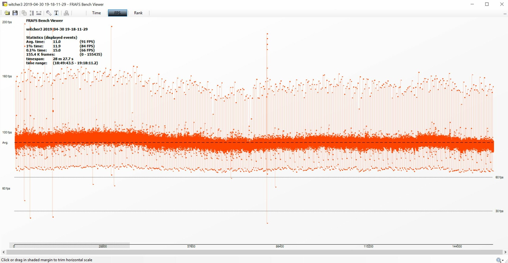 Beim Blick auf den Frameverlauf, welchen wir mit The Witcher 3 (Ultra-Preset) erstellt haben, wird deutlich, dass auch längere Spielesessions ohne Leistungseinbußen zu erwarten sind. Mit durchschnittlich über 90 FPS ist ruckelfreies Spielen garantiert und auch die Frametimes zeigen bis auf einzelne Ausreißer, welche keine Bedeutung haben, keine Auffälligkeiten.
