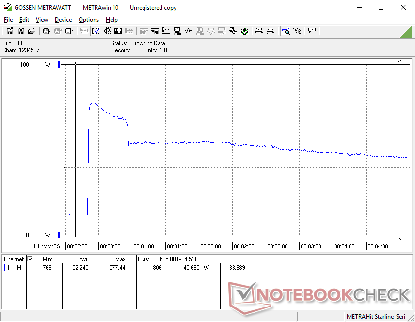 Im Leerlauf benötigt der kleine Rechner zwischen 10 und 11 Watt und bis zu 51 Watt beim Spielen. Interessanterweise ist der Verbrauch damit spürbar höher als beim XPS 13 9370, obwohl dieser neben dem i7-8550U auch noch einen 4K-Bildschirm betreiben muss. Bei extremer Belastung sind es durchschnittlich 63 Watt, die das kleine 65-Watt-Netzteil (~10,5 x 4,5 x 3 cm) zur Verfügung stellen muss. Wir konnten sogar noch höhere Werte messen, ein größeres Netzteil wäre also nicht schlecht gewesen.
