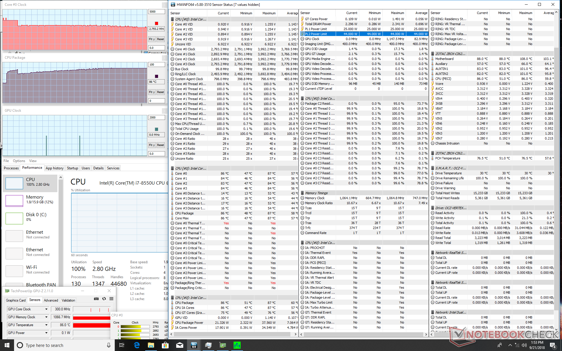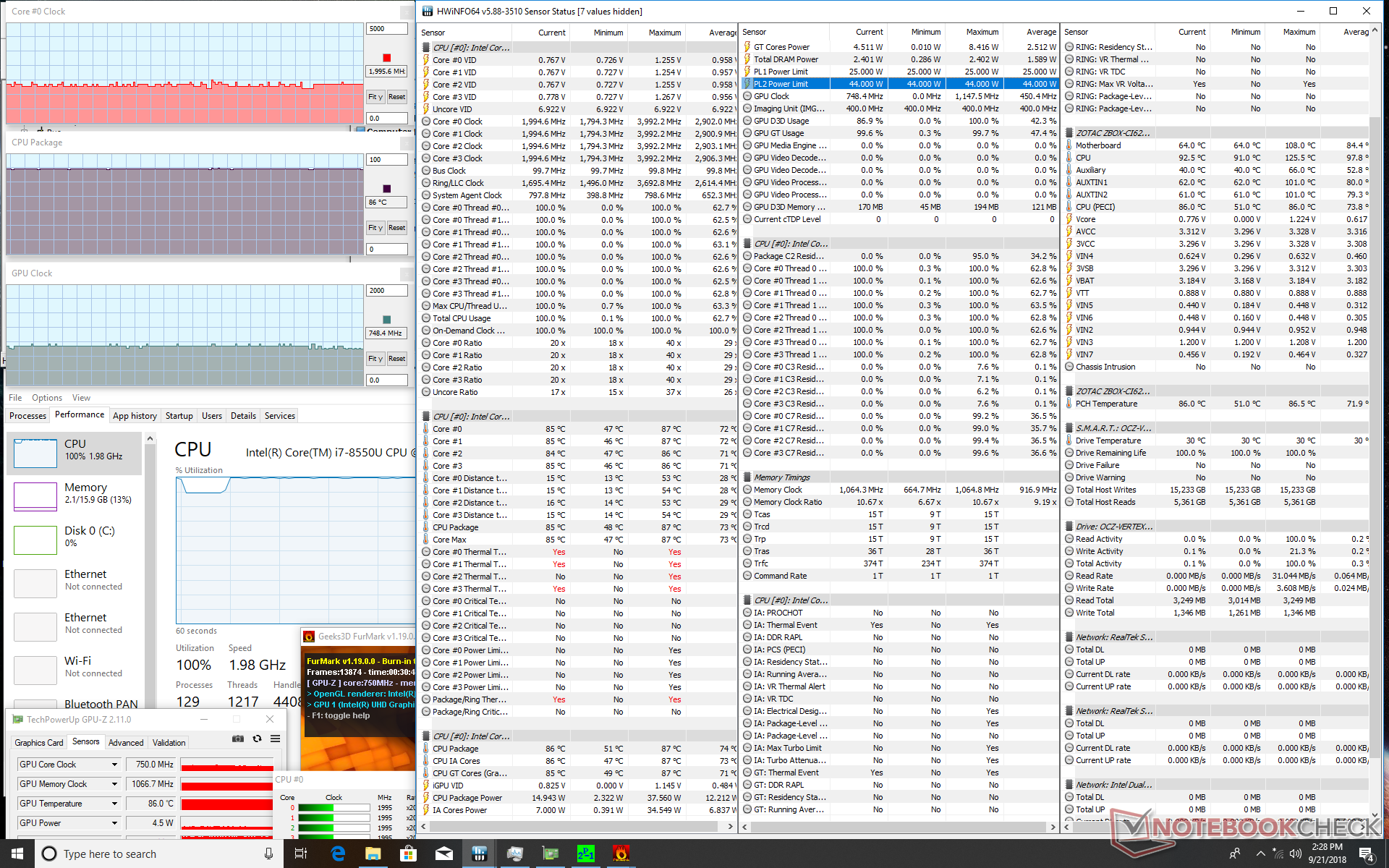Bei der gleichzeitigen Belastung durch Prime95 und FurMark fällt der CPU-Takt auf 2,0 GHz, doch die Temperatur bleibt bei maximal 86 °C.