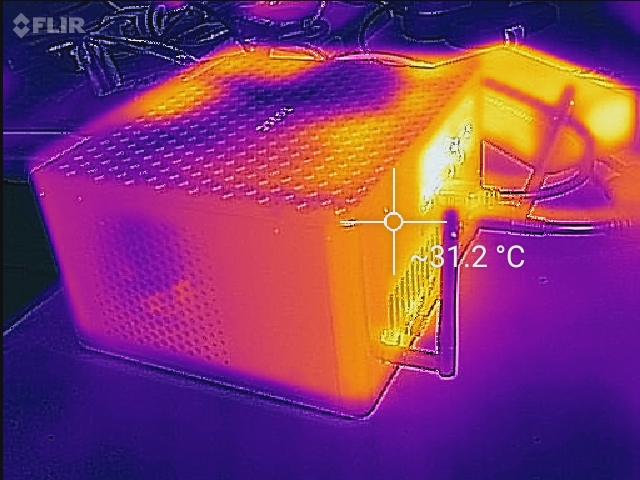 As the Magnus EK71080 is a desktop PC, users shouldn't need to worry too much about exterior temperatures. Still, the Magnus remains fairly cool when under load. The hottest spots lie along the top mesh and rear exhaust vents. So long as users do not place anything on top of or directly behind the unit, heat will be adequately exhausted. The vents along the side act as intakes and should not be blocked either. As such, the unit should be set in its standard orientation (Zotac logo on top) only.
