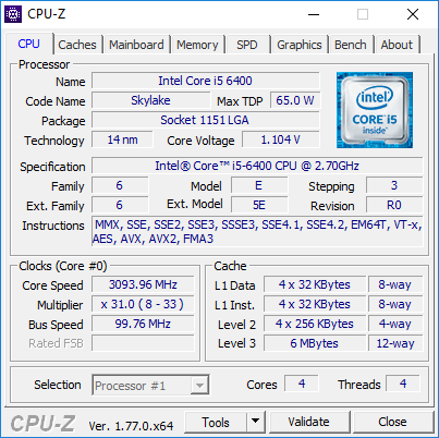 Der Core i5-6400 Quad-Core-Prozessor nutzt einen Basistakt von 2,7 GHz. Dank Turbo Boost kann die Taktrate auf bis zu 3,3 GHz erhöht werden. Diese Skylake-CPU ist in Notebooks nicht verfügbar, da es sich um einen Desktop-Prozessor handelt und Notebooks, die über einen LGA 1151 Socket verfügen - wie das Eurocom DLX7 - üblicherweise schnellere CPU-Optionen wie das i7-6700K bieten. Leider erreicht der Prozessor im EN980 nur einen maximalen Takt von 3,1 GHz und bleibt damit 200 MHz unter seinem Nenn-Maximum. Für weitere technische Informationen über diesen Prozessor verweisen wir auf Intel's Spezialseite zum i5-6400.