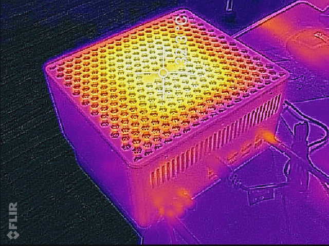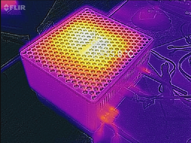 Kein Problem sind die Oberflächentemperaturen an den Seiten des Gerätes. Der Lüfter zieht kalte Luft sowohl über die Lüftergrille an Rückseite als auch die Unterseite hinein. Untenstehende Temperatur-Bilder zeigen das Ergebnis dieses Designs, da die Lüfterabdeckungen an der Oberseite im zentralen Bereich hohe 57 °C erreichen können. Der gleiche Bereich erwärmt sich auf zirka 32 °C, wenn das Gerät bei einer Umgebungstemperatur von 20 °C Idle läuft. Wir wollen das Gerät nicht als persönlichen Heizkörper bezeichnen, doch dies lässt sich in Anbetracht dieses Designs und des offensichtlichen Wärmeausstoßes schwer leugnen.