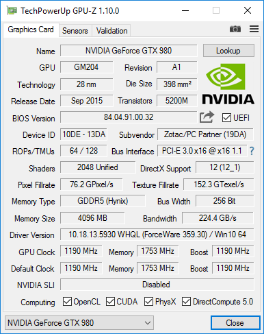 Ein Blick auf die GPU-Z Information zur GTX 980 GPU-Z zeigt, dass es sich um eine vollwertige GTX 980 und nicht um eine GTX 980M handelt. Das heißt, dass sie alle 2.048 CUDA-Kerne anstatt 1.536 wie die GTX 980M mitbringt. Allerdings sollte man berücksichtigen, dass die 4 GB GDDR5 VRAM fest sind und es eine keine Option auf 8 GB gibt. Einige Gaming-Notebooks wie das Asus G701VO und bestimmte Clevo-Barebones statten die GTX 980 für mehr Leistung in 4K-Auflösungen mit 8 GB GDDR5 VRAM aus.