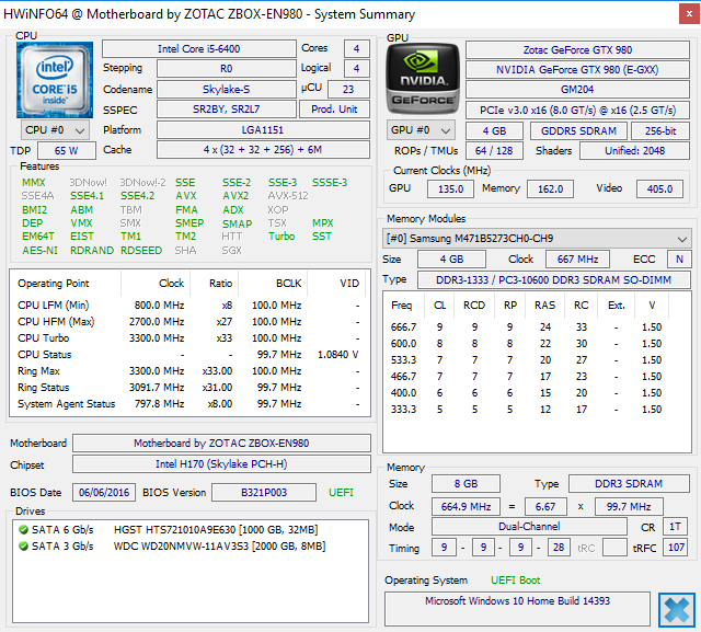 | Zotac ZBOX Magnus EN980-U GeForce GTX 980, 6400, HGST Travelstar 7K1000 HTS721010A9E630 | Asus G701VO-CS74K GeForce GTX 980 (Laptop), 6820HK, 2x Samsung SM951 MZVPV512HDGL (RAID 0) | MSI GT72VR 6RE-015US GeForce GTX 1070 Mobile, 6700HQ, SanDisk SD8SNAT256G1122 | Aorus X7 Pro v5 GeForce GTX 970M SLI, 6820HK, Samsung SM951 MZVPV512 m.2 PCI-e | Eurocom Sky DLX7 GeForce GTX 980 (Laptop), 6700K, Samsung SM951 MZVPV512HDGL m.2 PCI-e | |