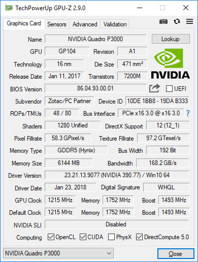 | Zotac ZBOX-QK7P3000 Quadro P3000, i7-7700T, Samsung SSD 960 Pro 512 GB m.2 | Intel Hades Canyon NUC8i7HVK Vega M GH, i7-8809G, Intel Optane 120 GB SSDPEK1W120GA | Zotac ZBOX Magnus EK71080 GeForce GTX 1080 (Desktop), i7-7700HQ, Samsung PM961 MZVLW256HEHP | Apple iMac Pro Pro Vega 56, W-2145 | HP ZBook 17 G3 TZV66eA Quadro M3000M, E3-1535M v5, Samsung SM951 MZVPV256HDGL m.2 PCI-e | Lenovo ThinkPad P52s-20LB000HGE Quadro P500, i5-8550U, Samsung PM961 MZVLW256HEHP | |