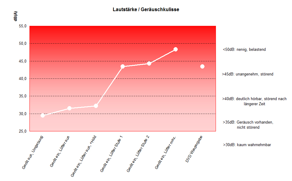 Unter Last konnten wir rekordverdächtige Werte von bis zu 49,1 dB messen. Beim Betrieb mit der T2400 CPU bot sich dasselbe Bild.