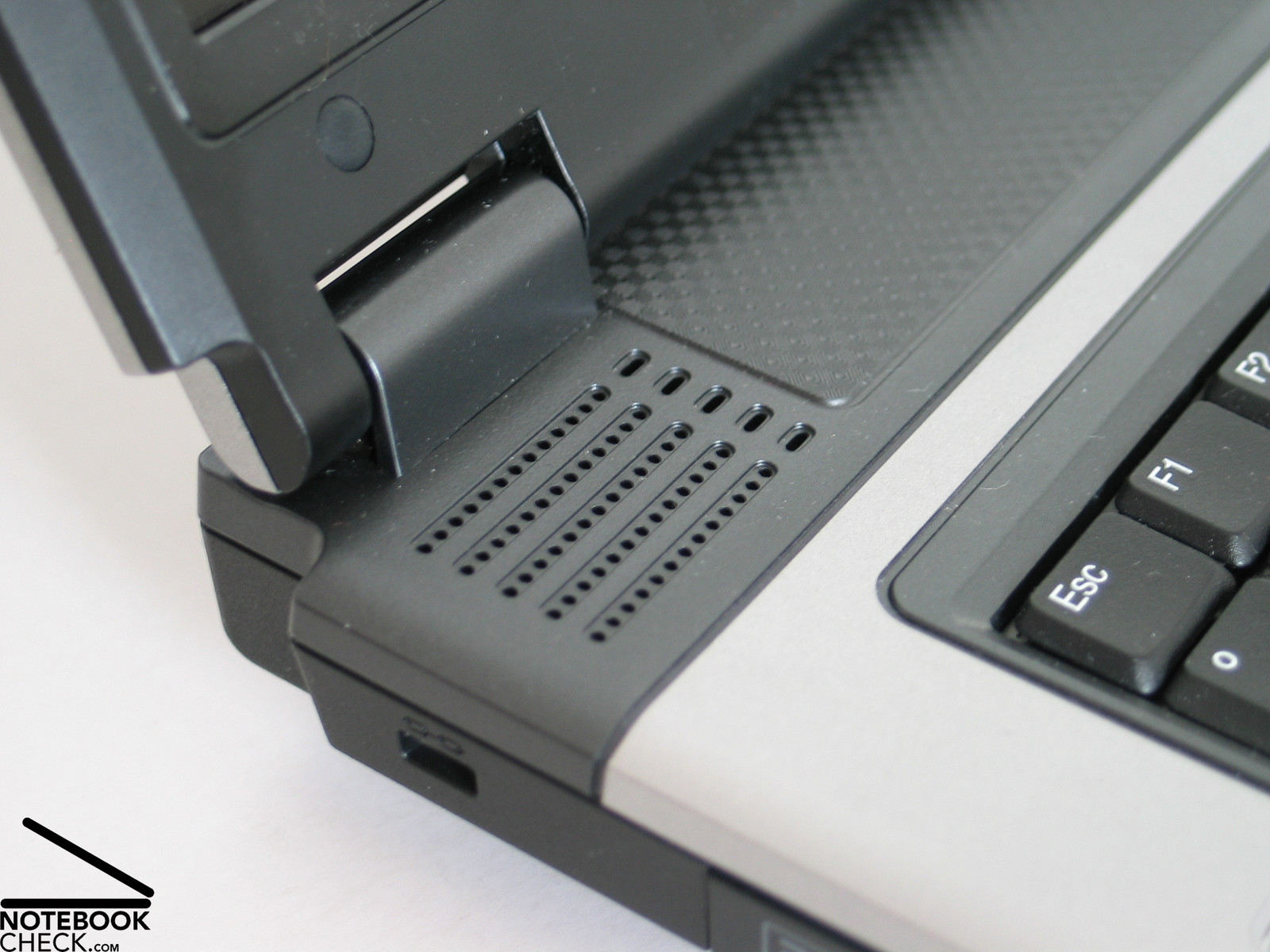 Die Anschlussverteilung scheint grundsätzlich einigermaßen sinnvoll. An der linken Seite befinden sich ganz vorne die Audio Ports (Micro, Headphones, LineIn und S/PDIF Out) und der RJ-11 Modem Port. Außerdem ist im hinteren Bereich ein Kensington Lock platziert.