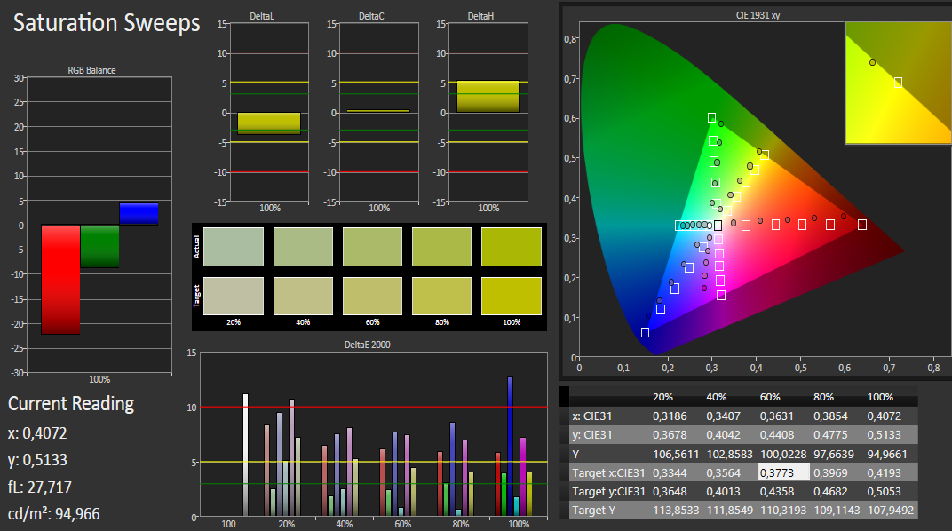 | sRGB Coverage (%) | 74.2 | 77.5 4% | 80.4 8% | 73.3 -1% | 68.9 -7% | 71.6 -4% | 85.9 16% | |||
