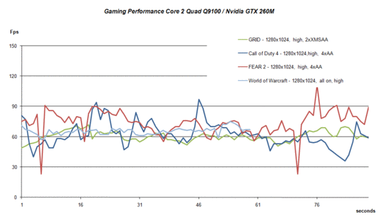 In der uns vorliegenden Ausstattung kam mit der Geforce GTX 260M allerdings die momentan zweitstärkste nicht-SLI Grafiklösung aus dem Hause Nvidia zum Einsatz. Basierend auf dem G92b Kern (9800M GTX), allerdings in 55 Nanometer gefertigt und mit 550 Mhz Kerntakt und 1375 Mhz Shader Takt versehen, ordnet sich der Grafikchip weit oben in der Leistungsklasse 1 unseres Vergleichs mobiler Grafikkarten ein. Damit ist das XMG5 auf jeden Fall als fit für aktuelle Games, auch unter DirectX 10, zu bezeichnen.