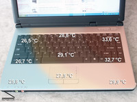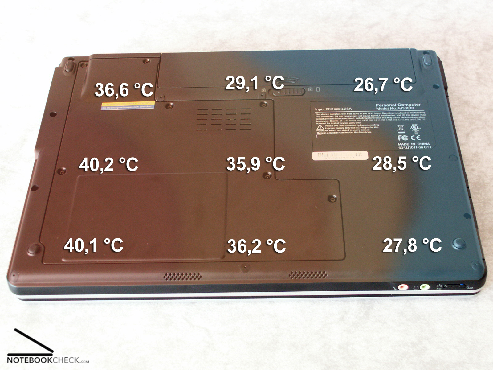 An der Geräteunterseite war unter Last eine maximale Temperatur von 40,2 °C messbar. Dies sollte beim mobilen Betrieb des Notebooks zu keinen Problemen führen.