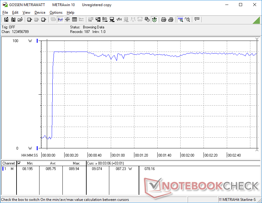 Mit dem mittelgroßen (ca. 13 x 6,5 x 2,9 cm) 90-W-Netzteil konnten wir unter Prime95-Stress eine maximale Leistungsaufnahme von 90 W verzeichnen. Dieser Höchstwert sinkt im Laufe der Zeit nicht besonders stark ab. Benutzer müssen also damit rechnen muss, dass sich die Ladegeschwindigkeit bei anspruchsvolleren Anwendungen verlangsamt.