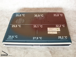 Auch der Luftstrom und das Gehäuse erwärmen sich nicht sonderlich (max. 35°C auf der Unterseite) und dies spricht für das überdimensionierte Kühlungskonzept. Hier wäre ein BIOS Update gefragt, damit sich der Lüfter ohne Last abschaltet.