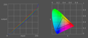 Der Verlauf der einzelnen Kurven bei der Visualisierung der Farbdarstellung zeigt eine relativ gleichmäßige Abweichung der jeweiligen Farbkurven. Subjektiv wirkt das dargestellte Bild gut.