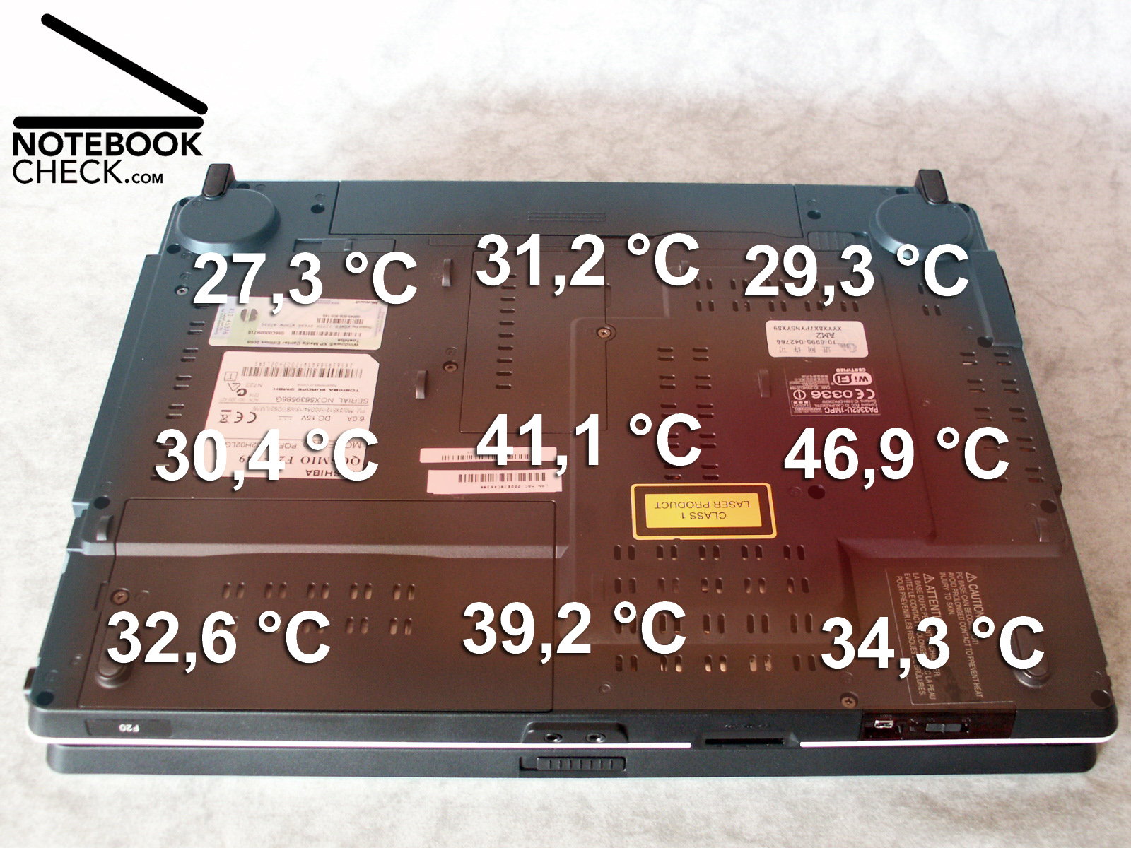 Die Erwärmung des Gerätes hält sich speziell an der Oberseite in Grenzen (maximal 36,6°C). An der Unterseite sind im Bereich des Lüfters deutlich höhere Temperaturen möglich (46,9°C).