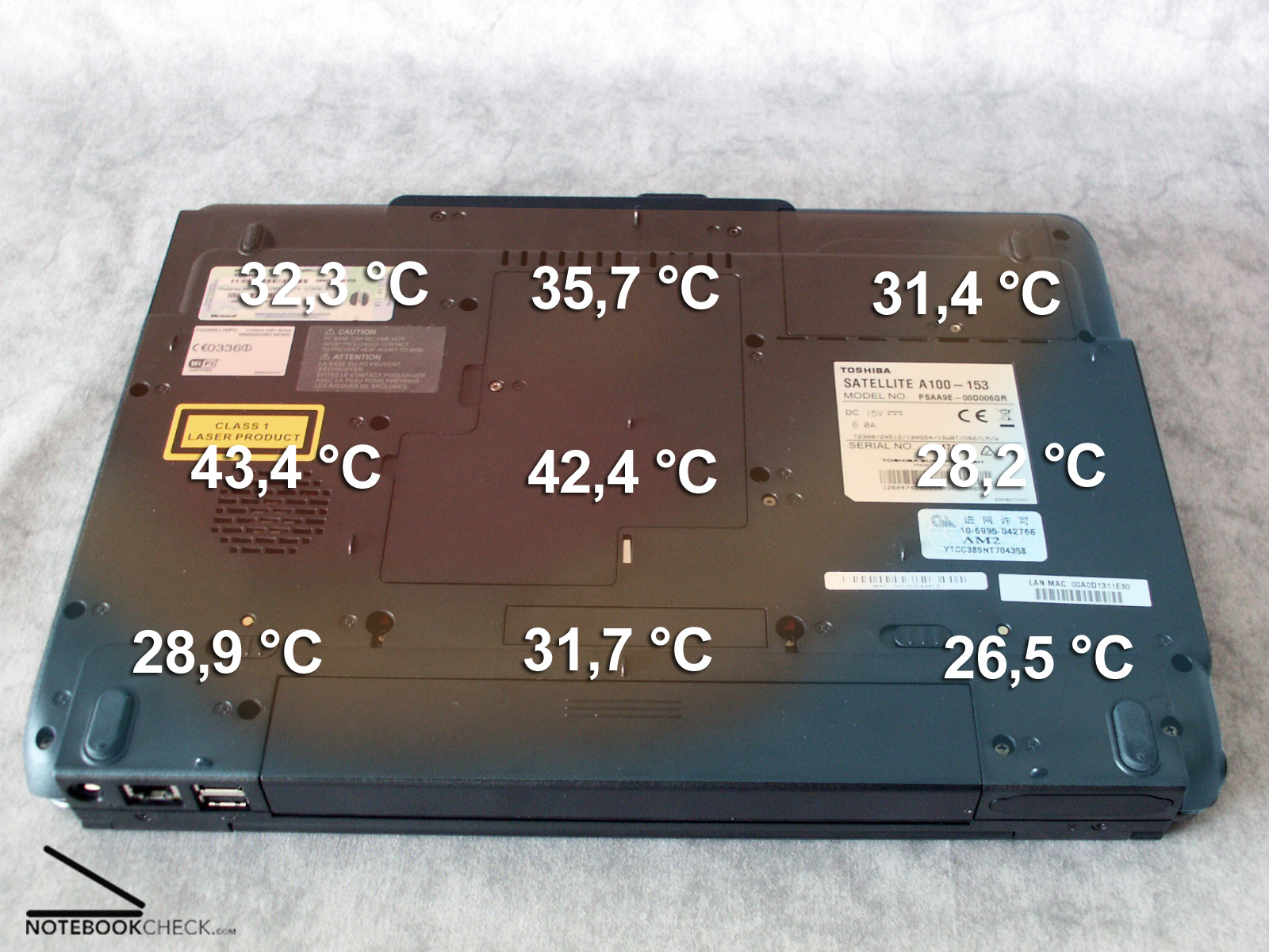 An der Geräteunterseite war unter Last eine maximale Temperatur von 43,4 °C messbar.