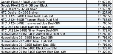 Das Huawei Mate 10 Pro kostete zum Start offiziell 799 Euro, in diesem Jahr wird sich dieser Preis wohl nicht halten lassen, geht man von aktuellen Leaks aus, die PhoneArena aus der Schweiz zugespielt wurden. Der anonyme Leaker hat Screenshots aus der Preistabelle eines Schweizer Distributors veröffentlicht, die neben bereits veröffentlichten Phones auch die Preise von Mate 20 und Mate 20 Pro zeigen.