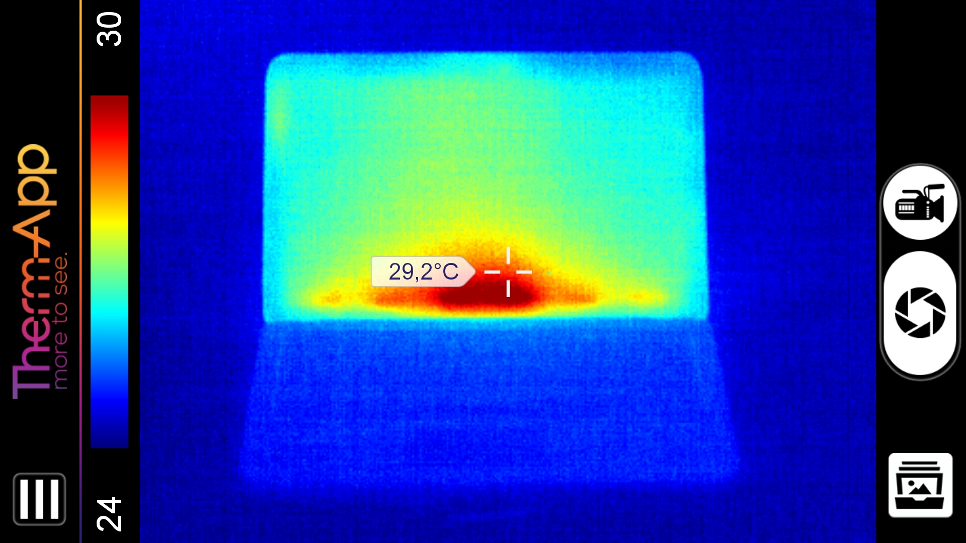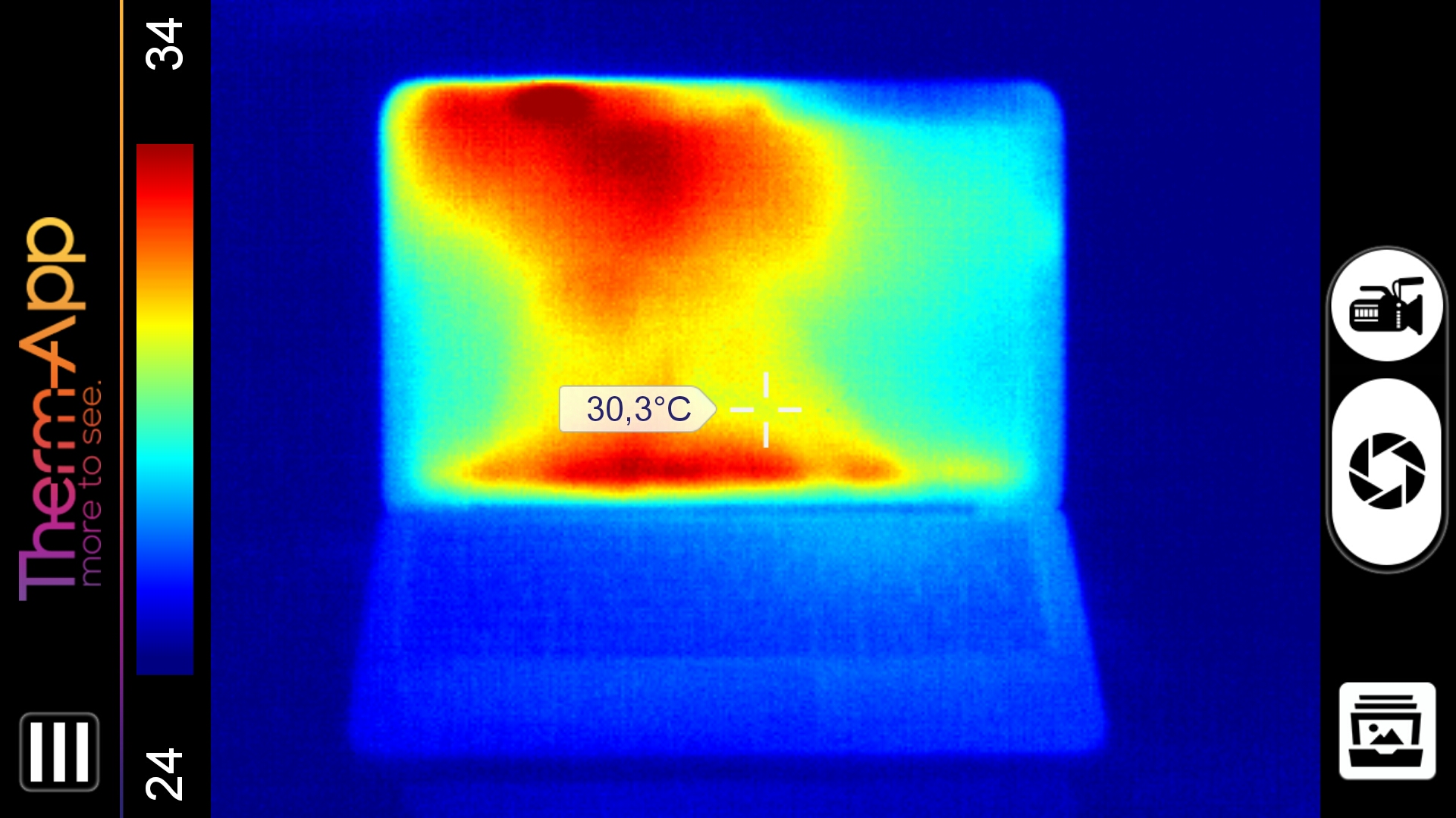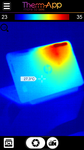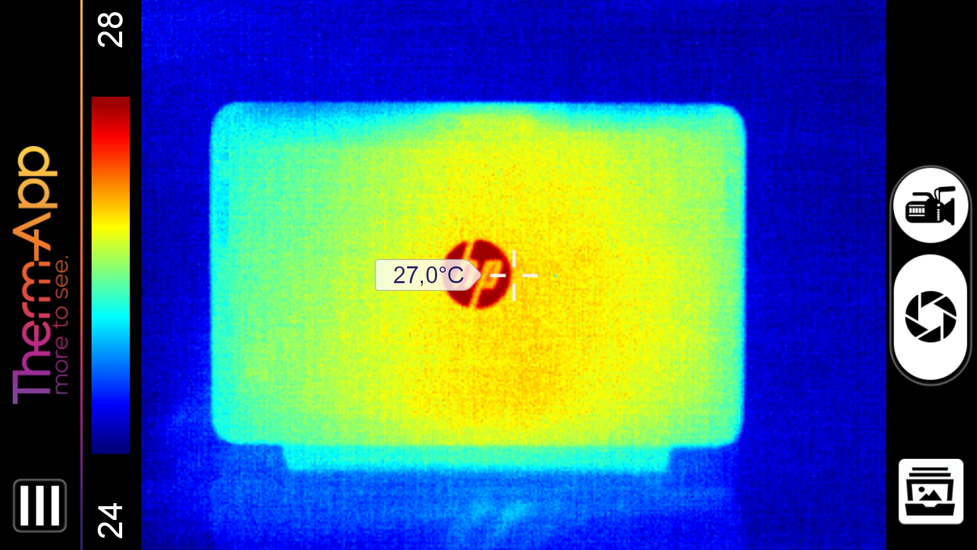 Genauso einfach wie die Installation fällt die Konfiguration und Nutzung von Therm-App. Direkt nach dem Start der Anwendung sieht der Nutzer auch schon ein Echtzeit-Wärmebild, dessen Schärfe gegebenenfalls noch per Fokusring angepasst werden muss. Eine seitliche Skala informiert über die Minimal- und Maximaltemperaturen im aktuellen Bildausschnitt, dazu zeigt ein (optionaler) Cursor die Temperatur in der Bildmitte auf 0,1 °C genau an. Da die Messunsicherheit vom Hersteller jedoch mit ± 3 °C oder ± 3 Prozent angegeben wird, sollte die Aussagekraft der Nachkommastelle mit Vorsicht betrachtet werden – auch in Anbetracht möglicher Unsicherheiten des eingestellten Emissionsgrades. Ober- und unterhalb des Bildes befinden sich die Tasten zur Aufnahme von Fotos und Videos (H.264, inkl. Ton), ein Link zur Galerie sowie das Optionsmenü. Dort erfolgt unter anderem die Umschaltung zwischen Thermografie- und Nachtsichtmodus, die Einstellung verschiedener Farbschemata sowie die Änderung des soeben angesprochenen Emissionsgrades.