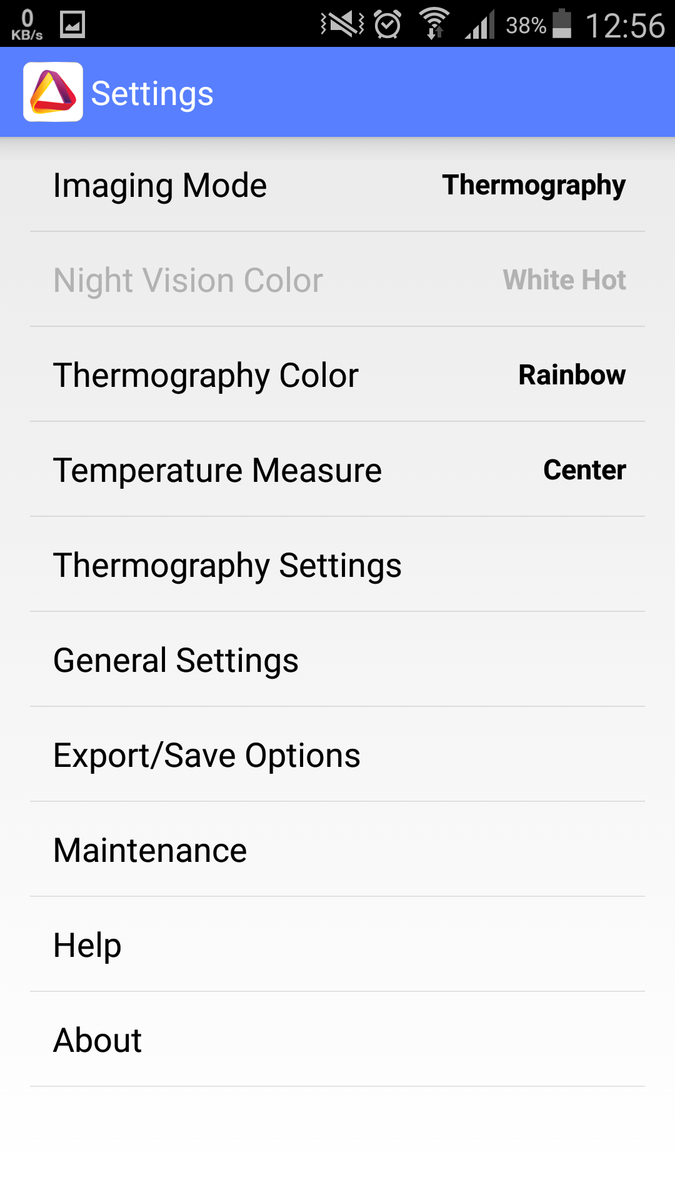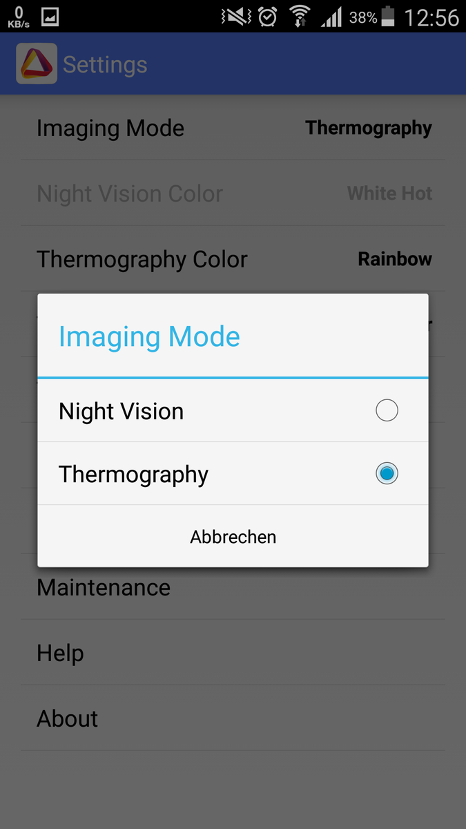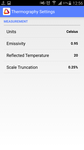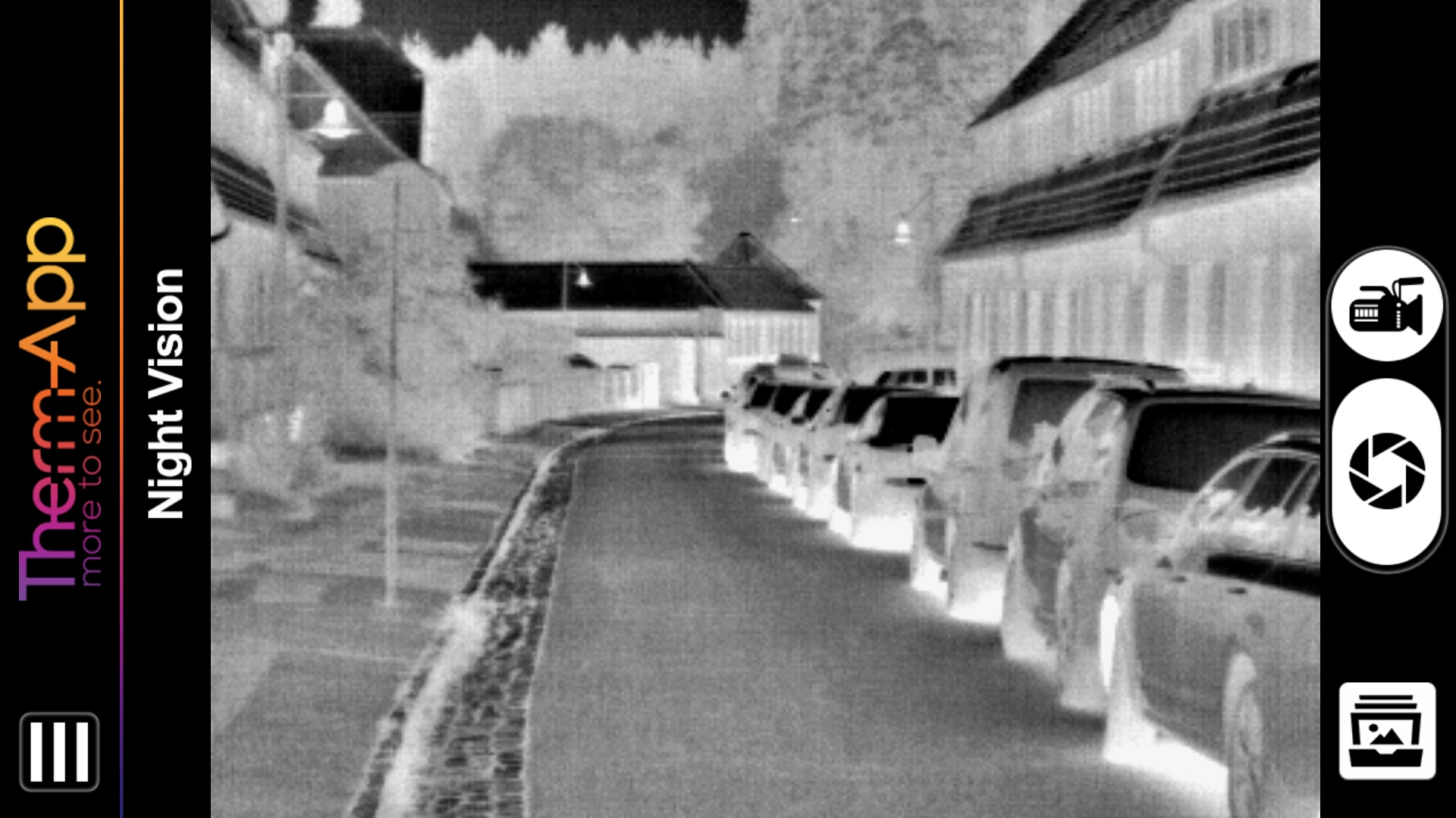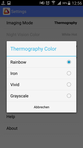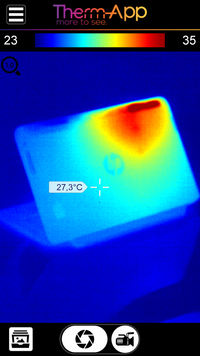 Genauso einfach wie die Installation fällt die Konfiguration und Nutzung von Therm-App. Direkt nach dem Start der Anwendung sieht der Nutzer auch schon ein Echtzeit-Wärmebild, dessen Schärfe gegebenenfalls noch per Fokusring angepasst werden muss. Eine seitliche Skala informiert über die Minimal- und Maximaltemperaturen im aktuellen Bildausschnitt, dazu zeigt ein (optionaler) Cursor die Temperatur in der Bildmitte auf 0,1 °C genau an. Da die Messunsicherheit vom Hersteller jedoch mit ± 3 °C oder ± 3 Prozent angegeben wird, sollte die Aussagekraft der Nachkommastelle mit Vorsicht betrachtet werden – auch in Anbetracht möglicher Unsicherheiten des eingestellten Emissionsgrades. Ober- und unterhalb des Bildes befinden sich die Tasten zur Aufnahme von Fotos und Videos (H.264, inkl. Ton), ein Link zur Galerie sowie das Optionsmenü. Dort erfolgt unter anderem die Umschaltung zwischen Thermografie- und Nachtsichtmodus, die Einstellung verschiedener Farbschemata sowie die Änderung des soeben angesprochenen Emissionsgrades.