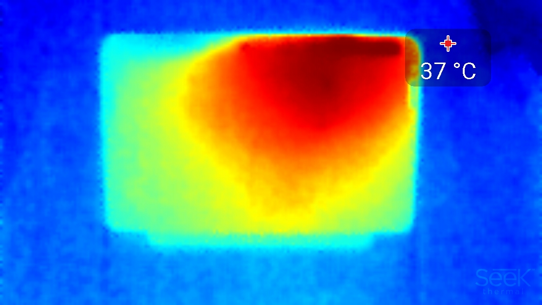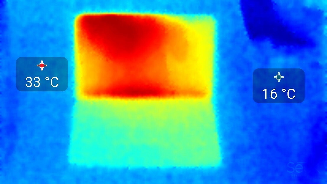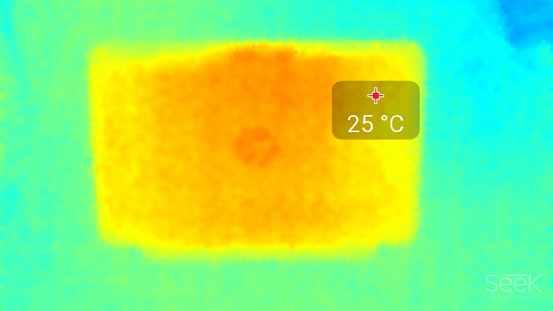 Im Vergleich mit unserem Infrarotthermometer zeigt die Seek Compact zumeist etwas geringere Werte an, wobei die Differenz im Regelfall bei etwa zwei Kelvin oder darunter liegt. Bei lokal begrenzten Temperaturmaxi- oder -minima lassen sich bedingt durch die relativ niedrige Auflösung allerdings auch größere Abweichungen nicht ausschließen.