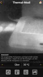Das Hauptmenü direkt nach Programmstart ähnelt dem der Therm-App und wird vor allem von der bildfüllenden Thermografie-Ansicht dominiert, um die sich verschiedene Menüelemente gruppieren. Neben den Buttons für Foto- und Videoaufnahme, einer Verknüpfung zur Galerie sowie verschiedenen Einstellungsoptionen findet sich hier auch der sogenannte "Wärme+"-Modus, der in einer praktischen Splitscreen-Ansicht das Echtzeitbild von Smartphone- und Wärmebildkamera gegenüberstellt.
