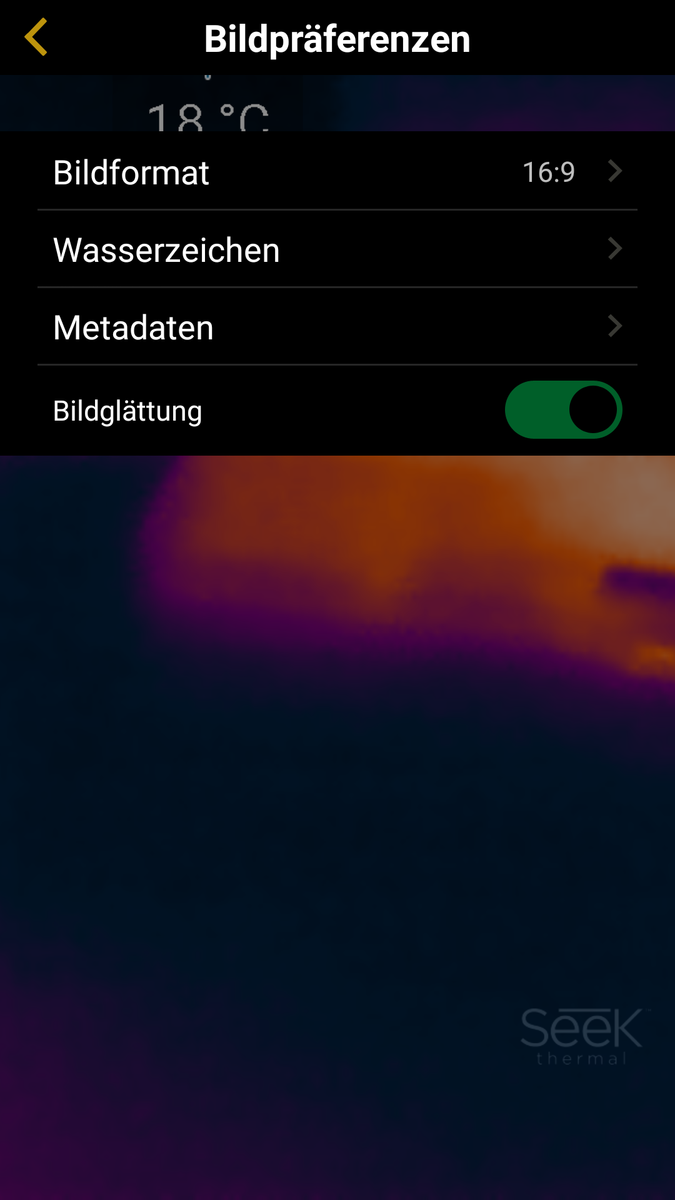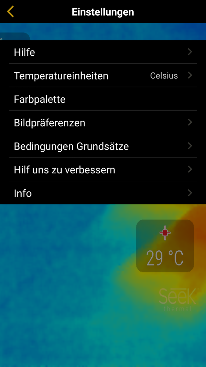 Trotz Beschreibung in der Hilfe-Funktion vergeblich gesucht haben wir die Möglichkeit, den Emissionsgrad manuell einzustellen. Die angezeigten Temperaturen lassen zwar einen sinnvollen Standardwert von 0,9 bis 0,95 vermuten, doch kann bei bestimmten Oberflächen eine händische Anpassung zwingend vonnöten sein. Insbesondere für metallisch-glänzende Materialien wäre die Seek Compact so nur sehr eingeschränkt nutzbar.