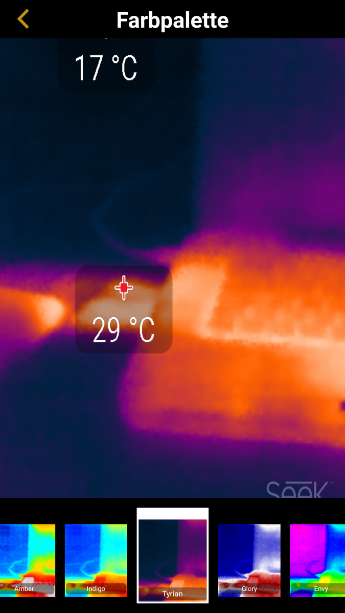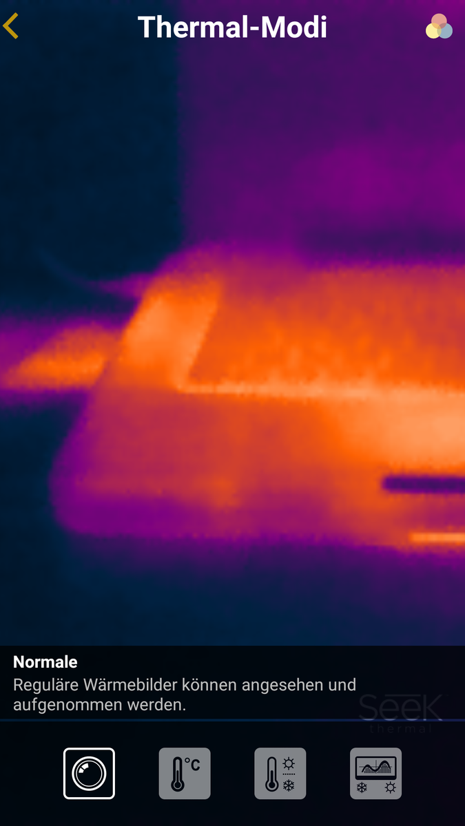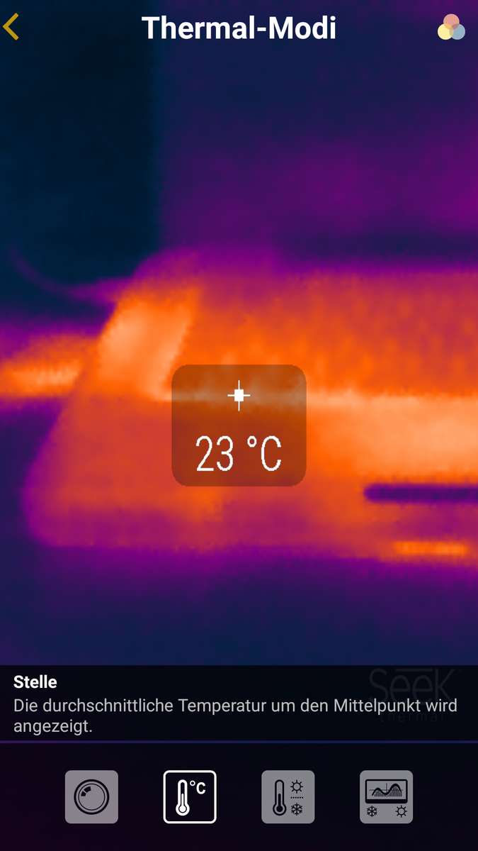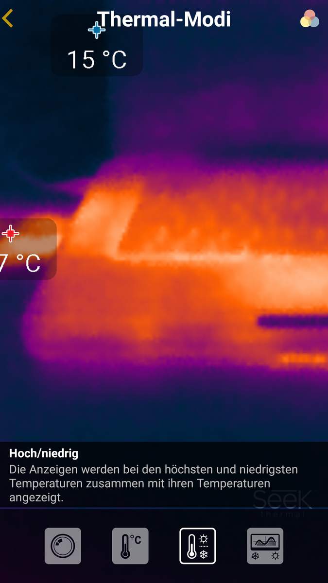 Was der Seek Compact hardwareseitig fehlen mag, macht sie mit ihrem Feature-Umfang wieder wett. Neun verschiedene Farbmodi, einblendbare Min-/Max-Cursor (die allerdings gerne mal so weit an den Bildrand rutschen, dass die angezeigten Werte nicht mehr zu erkennen sind) und sogar ein praktischer Grenzwert-Modus, der Bereiche größer/kleiner/gleich einer gewählten Temperatur speziell hervorhebt, helfen dem Anwender bei der Arbeit.
