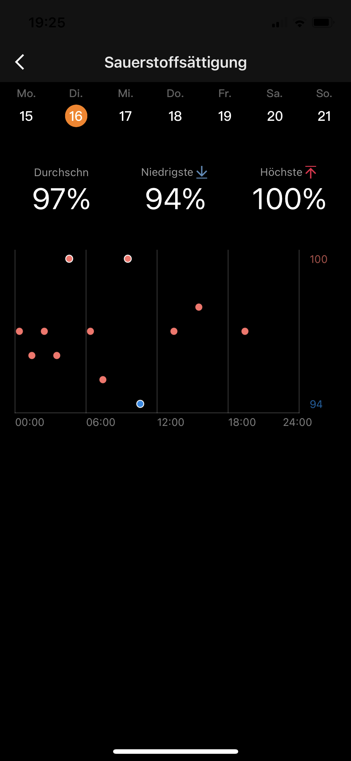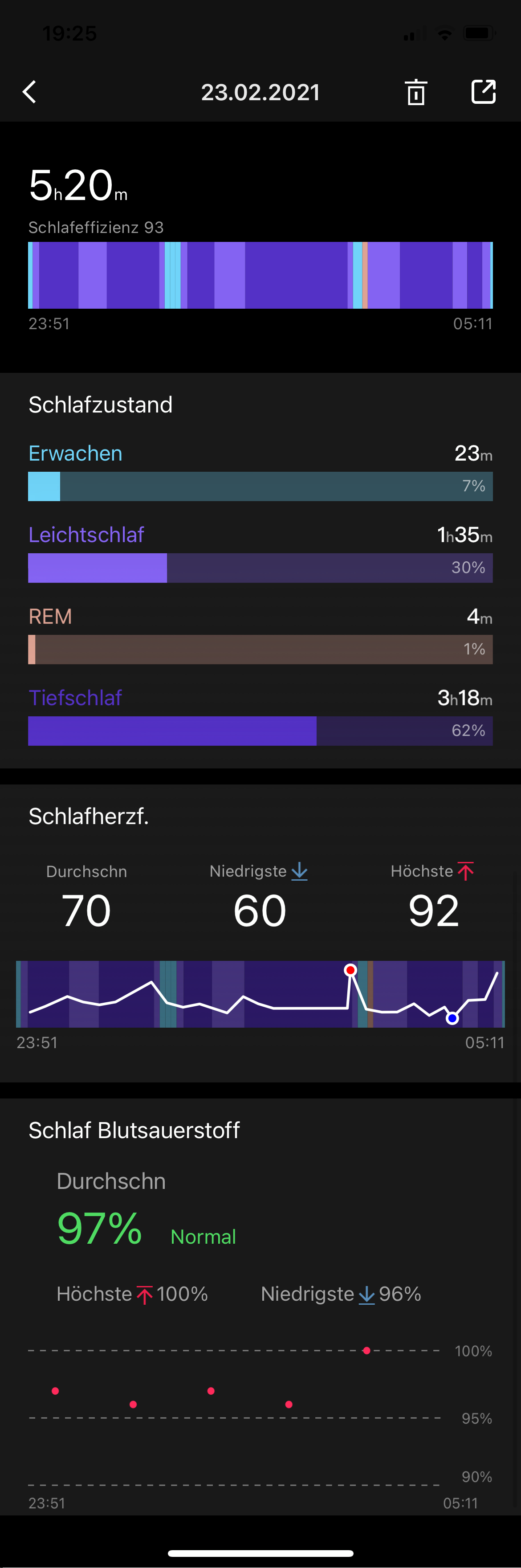 Die Sauerstoffsättigung misst die TicWatch Pro 3 LTE auf Wunsch nachts und mehrmals täglich automatisch. Zusätzliche einzelne manuelle Messungen haben wir mit einem medizinisch zertifizierten Gerät verglichen; dabei lag die Smartwatch im Durchschnitt 1 Prozentpunkt neben dem zertifizierten Messgerät.