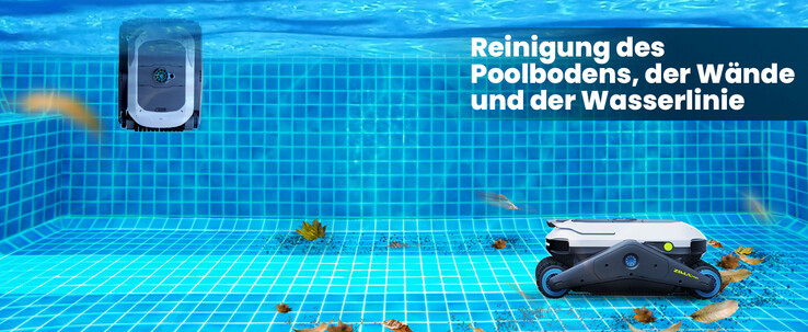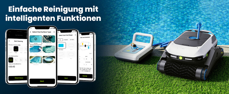 Auf Wunsch lässt sich der Roboter via App zudem wie ein ferngesteuertes Auto lenken. Wenn der 10.000 mAh große Akku des Poolroboters nach bis zu 3,5 Stunden Reinigungszeit zuneige geht, wird er per simplem Tippen auf den Bildschirm an die Wasseroberfläche und den Beckenrand gerufen, damit man nicht selbst ins Wasser muss.